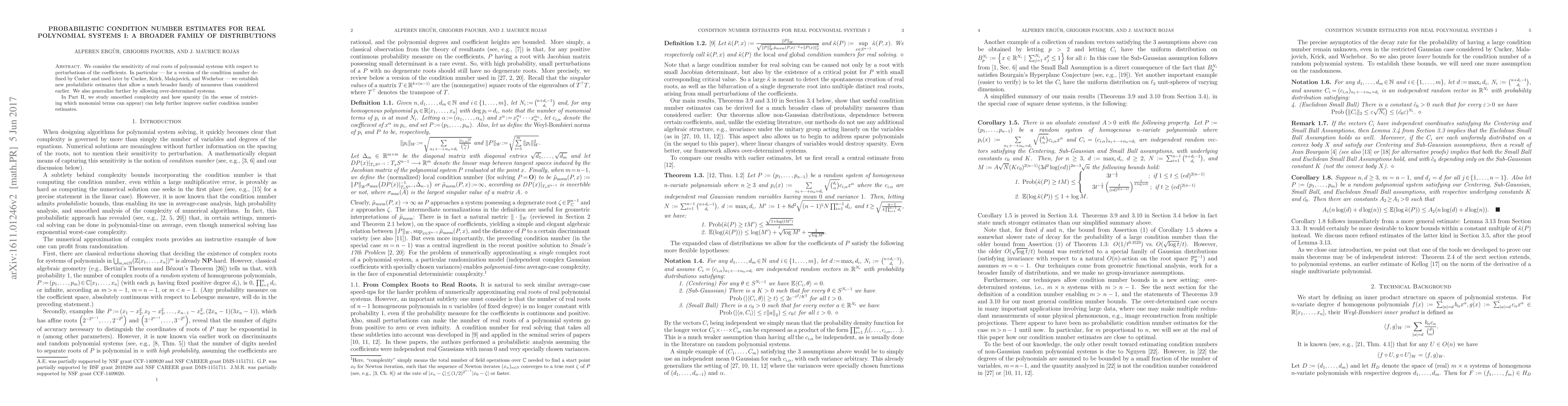 We consider the sensitivity of real roots of polynomial systems with respect to perturbations of the coefficients. In particular - for a version of the condition number defined by Cucker, Krick, Malajovich, and Wschebor - we establish new probabilistic estimates that allow a much broader family of measures than considered earlier. We also generalize further by allowing over-determined systems. Along the way, we derive new Lipshitz estimates for polynomial maps from R^n to R^m, extending earlier work of Kellog on the case m=1, which may be of independent interest. In Part II, we study smoothed complexity and how sparsity (in the sense of restricting which monomial terms can appear) can help further improve earlier condition number estimates.