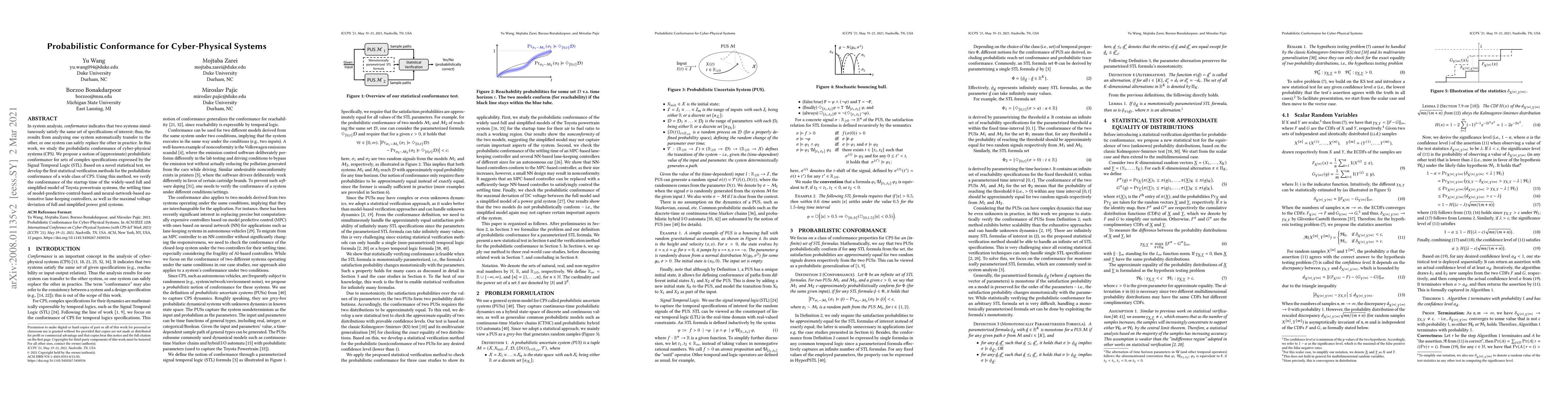 This paper introduces a concept of probabilistic conformance for cyber-physical systems (CPS) to ensure that two systems meet the same specifications, proposing a statistical test and verification methods for complex specifications expressed in Signal Temporal Logic (STL). The method is demonstrated through verifying conformance in automotive and power grid systems.