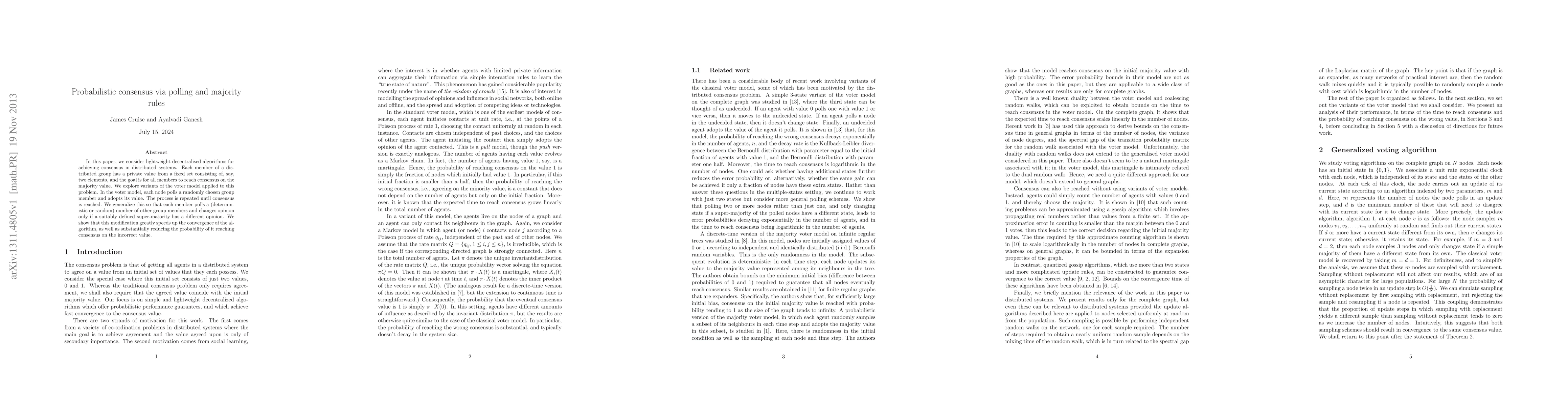 In this paper, we consider lightweight decentralised algorithms for achieving consensus in distributed systems. Each member of a distributed group has a private value from a fixed set consisting of, say, two elements, and the goal is for all members to reach consensus on the majority value. We explore variants of the voter model applied to this problem. In the voter model, each node polls a randomly chosen group member and adopts its value. The process is repeated until consensus is reached. We generalize this so that each member polls a (deterministic or random) number of other group members and changes opinion only if a suitably defined super-majority has a different opinion. We show that this modification greatly speeds up the convergence of the algorithm, as well as substantially reducing the probability of it reaching consensus on the incorrect value.