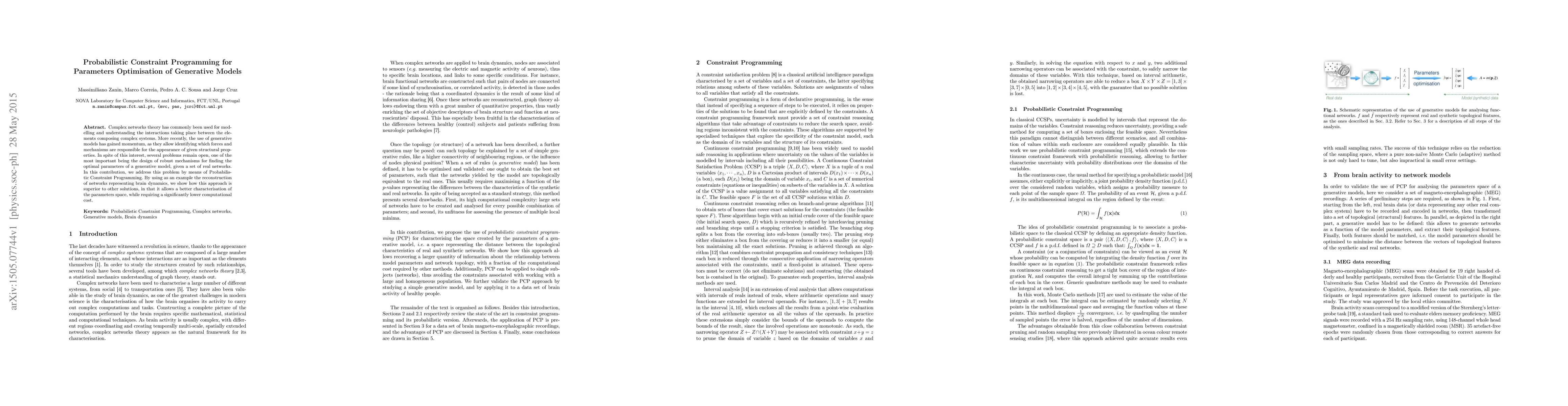 Complex networks theory has commonly been used for modelling and understanding the interactions taking place between the elements composing complex systems. More recently, the use of generative models has gained momentum, as they allow identifying which forces and mechanisms are responsible for the appearance of given structural properties. In spite of this interest, several problems remain open, one of the most important being the design of robust mechanisms for finding the optimal parameters of a generative model, given a set of real networks. In this contribution, we address this problem by means of Probabilistic Constraint Programming. By using as an example the reconstruction of networks representing brain dynamics, we show how this approach is superior to other solutions, in that it allows a better characterisation of the parameters space, while requiring a significantly lower computational cost.