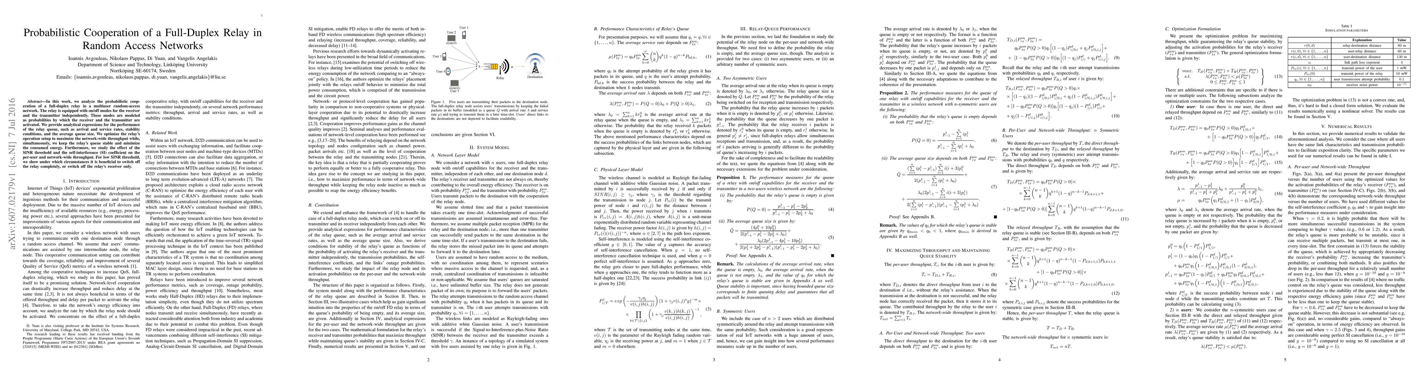 In this work, we analyze the probabilistic cooperation of a full-duplex relay in a multiuser random-access network. The relay is equipped with on/off modes for the receiver and the transmitter independently. These modes are modeled as probabilities by which the receiver and the transmitter are activated. We provide analytical expressions for the performance of the relay queue, such as arrival and service rates, stability conditions, and the average queue size. We optimize the relay's operation setup to maximize the network-wide throughput while, simultaneously, we keep the relay's queue stable and minimize the consumed energy. Furthermore, we study the effect of the SINR threshold and the self-interference (SI) coefficient on the per-user and network-wide throughput. For low SINR threshold, we show under which circumstances it is beneficial to switch off the relay completely, or switch off the relay's receiver only.