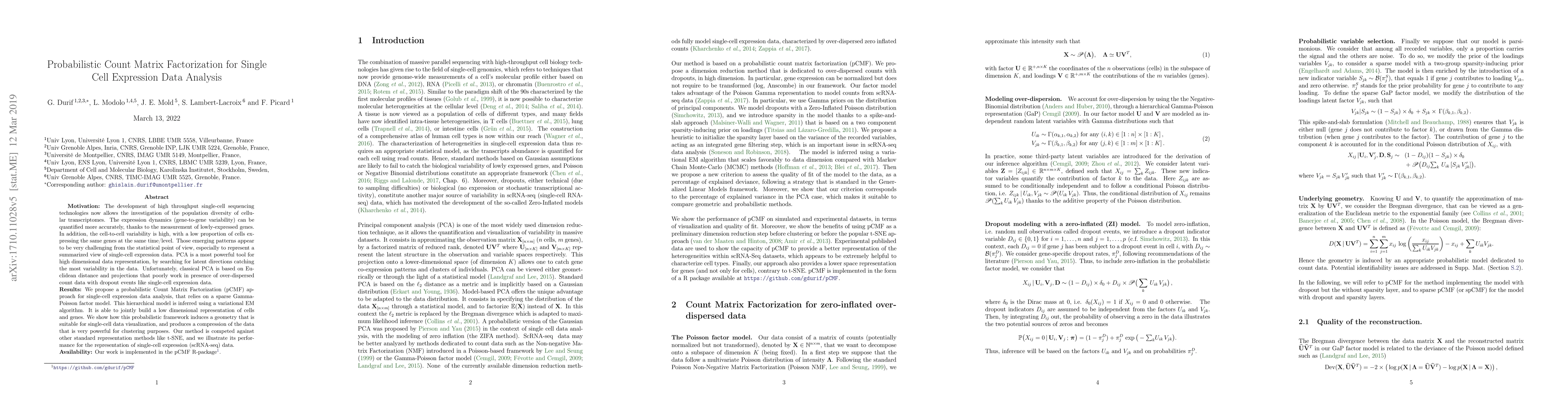 The development of high throughput single-cell sequencing technologies now allows the investigation of the population level diversity of cellular transcriptomes. This diversity has shown two faces. First, the expression dynamics (gene to gene variability) can be quantified more accurately, thanks to the measurement of lowly-expressed genes. Second, the cell-to-cell variability is high, with a low proportion of cells expressing the same gene at the same time/level. Those emerging patterns appear to be very challenging from the statistical point of view, especially to represent and to provide a summarized view of single-cell expression data. PCA is one of the most powerful framework to provide a suitable representation of high dimensional datasets, by searching for latent directions catching the most variability in the data. Unfortunately, classical PCA is based on Euclidean distances and projections that work poorly in presence of over-dispersed counts that show drop-out events (zero-inflation) like single-cell expression data We propose a probabilistic Count Matrix Factorization (pCMF) approach for single-cell expression data analysis, that relies on a sparse Gamma-Poisson factor model. This hierarchical model is inferred using a variational EM algorithm. It is able to jointly build a low dimensional representation of cells and genes. We show how this probabilistic framework induces a geometry that is suitable for single-cell data visualization, and produces a compression of the data that is very powerful for clustering purposes. Our method is competed against other standard representation methods like t-SNE, and we illustrate its performance for the representation of single-cell data. We especially focus on publicly available single-cell RNA-seq datasets.