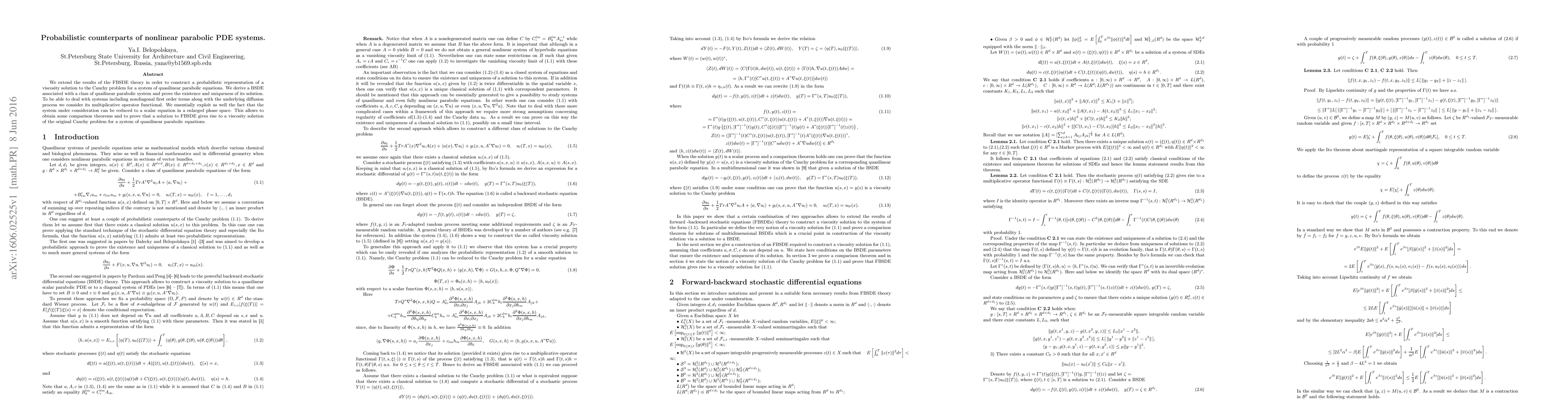 We extend the results of the FBSDE theory in order to construct a probabilistic representation of a viscosity solution to the Cauchy problem for a system of quasilinear parabolic equations. We derive a BSDE associated with a class of quailinear parabolic system and prove the existence and uniqueness of its solution. To be able to deal with systems including nondiagonal first order terms along with the underlying diffusion process we consider its multiplicative operator functional. We essentially exploit as well the fact that the system under consideration can be reduced to a scalar equation in a enlarged phase space. This allows to obtain some comparison theorems and to prove that a solution to FBSDE gives rise to a viscosity solution of the original Cauchy problem for a system of quasilinear parabolic equations.