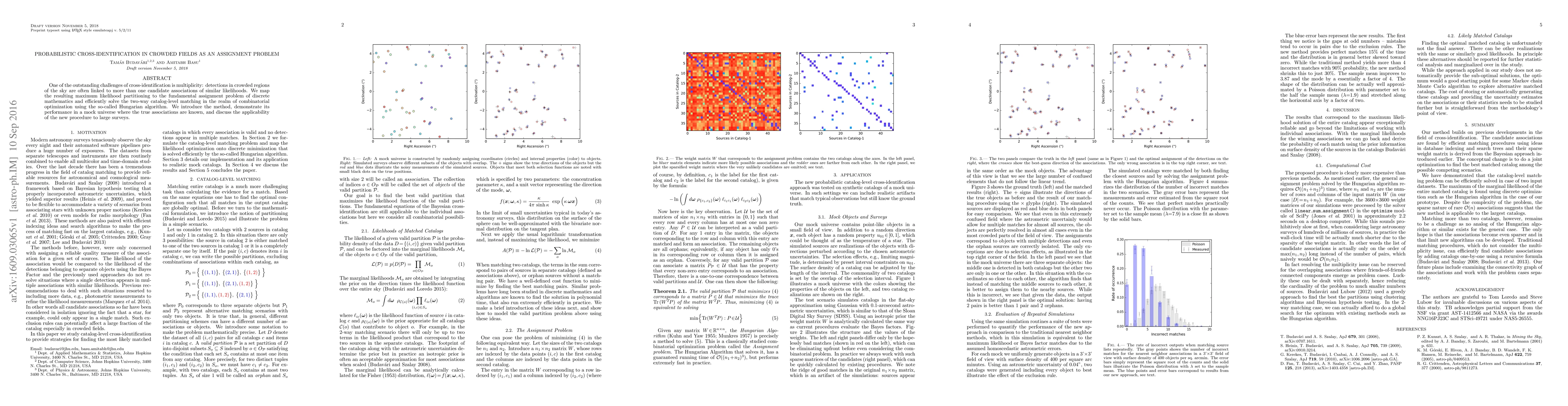 This paper proposes a method to solve the challenge of identifying multiple candidate associations in crowded sky regions using the Hungarian algorithm for combinatorial optimization. The method is demonstrated in a mock universe and shown to be applicable to large astronomical surveys.