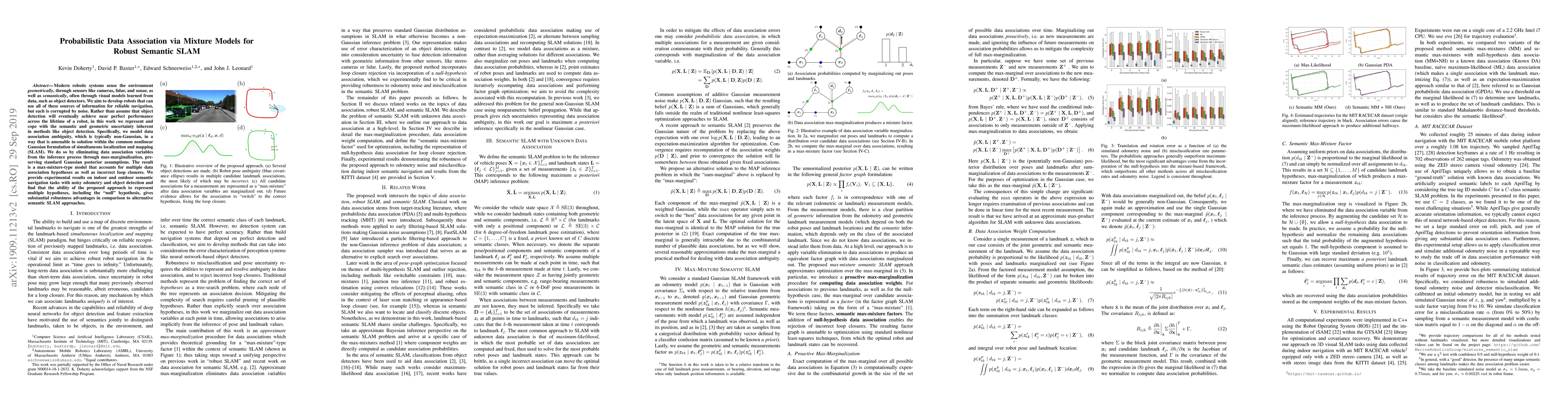 Modern robotic systems sense the environment geometrically, through sensors like cameras, lidar, and sonar, as well as semantically, often through visual models learned from data, such as object detectors. We aim to develop robots that can use all of these sources of information for reliable navigation, but each is corrupted by noise. Rather than assume that object detection will eventually achieve near perfect performance across the lifetime of a robot, in this work we represent and cope with the semantic and geometric uncertainty inherent in methods like object detection. Specifically, we model data association ambiguity, which is typically non-Gaussian, in a way that is amenable to solution within the common nonlinear Gaussian formulation of simultaneous localization and mapping (SLAM). We do so by eliminating data association variables from the inference process through max-marginalization, preserving standard Gaussian posterior assumptions. The result is a max-mixture-type model that accounts for multiple data association hypotheses as well as incorrect loop closures. We provide experimental results on indoor and outdoor semantic navigation tasks with noisy odometry and object detection and find that the ability of the proposed approach to represent multiple hypotheses, including the "null" hypothesis, gives substantial robustness advantages in comparison to alternative semantic SLAM approaches.