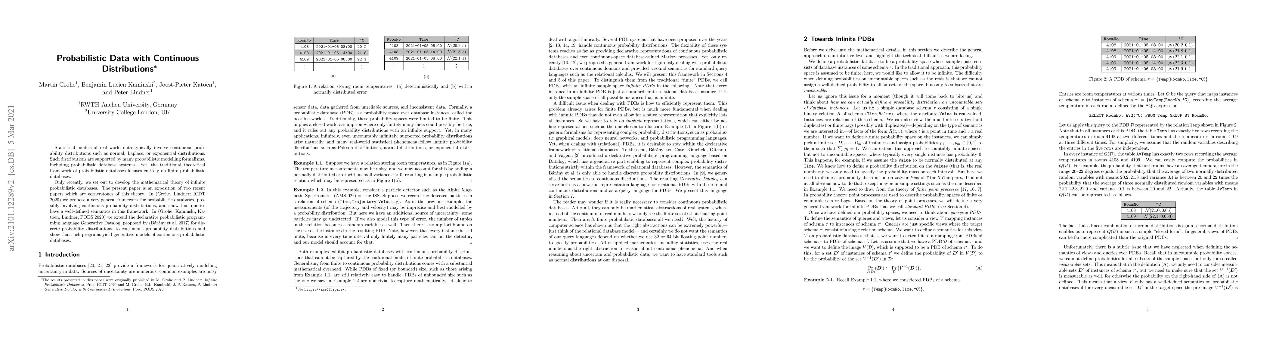 Statistical models of real world data typically involve continuous probability distributions such as normal, Laplace, or exponential distributions. Such distributions are supported by many probabilistic modelling formalisms, including probabilistic database systems. Yet, the traditional theoretical framework of probabilistic databases focusses entirely on finite probabilistic databases. Only recently, we set out to develop the mathematical theory of infinite probabilistic databases. The present paper is an exposition of two recent papers which are cornerstones of this theory. In (Grohe, Lindner; ICDT 2020) we propose a very general framework for probabilistic databases, possibly involving continuous probability distributions, and show that queries have a well-defined semantics in this framework. In (Grohe, Kaminski, Katoen, Lindner; PODS 2020) we extend the declarative probabilistic programming language Generative Datalog, proposed by (B\'ar\'any et al.~2017) for discrete probability distributions, to continuous probability distributions and show that such programs yield generative models of continuous probabilistic databases.