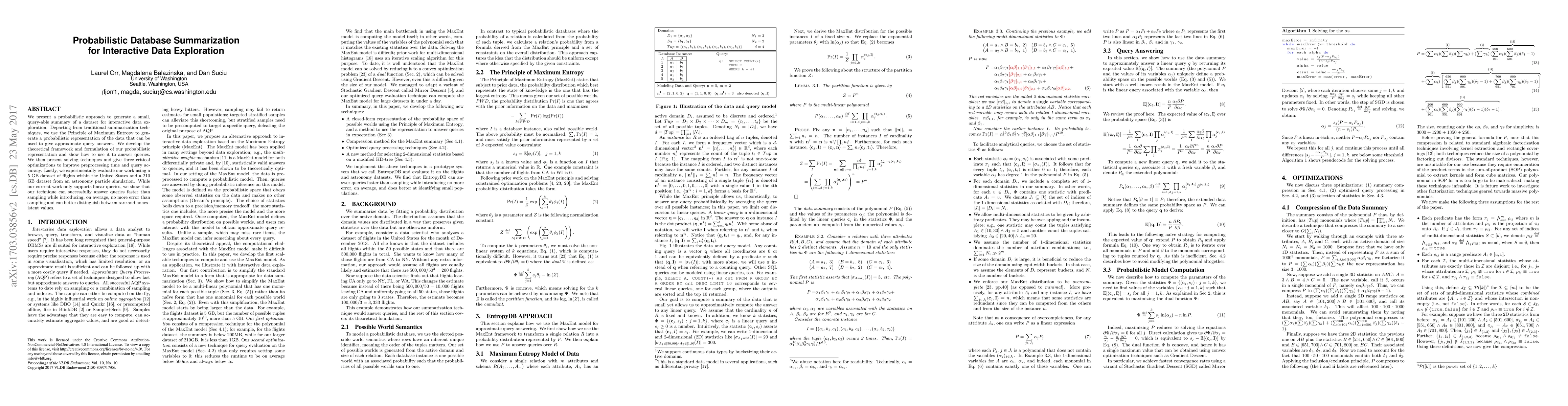 We present a probabilistic approach to generate a small, query-able summary of a dataset for interactive data exploration. Departing from traditional summarization techniques, we use the Principle of Maximum Entropy to generate a probabilistic representation of the data that can be used to give approximate query answers. We develop the theoretical framework and formulation of our probabilistic representation and show how to use it to answer queries. We then present solving techniques and give three critical optimizations to improve preprocessing time and query accuracy. Lastly, we experimentally evaluate our work using a 5 GB dataset of flights within the United States and a 210 GB dataset from an astronomy particle simulation. While our current work only supports linear queries, we show that our technique can successfully answer queries faster than sampling while introducing, on average, no more error than sampling and can better distinguish between rare and nonexistent values.