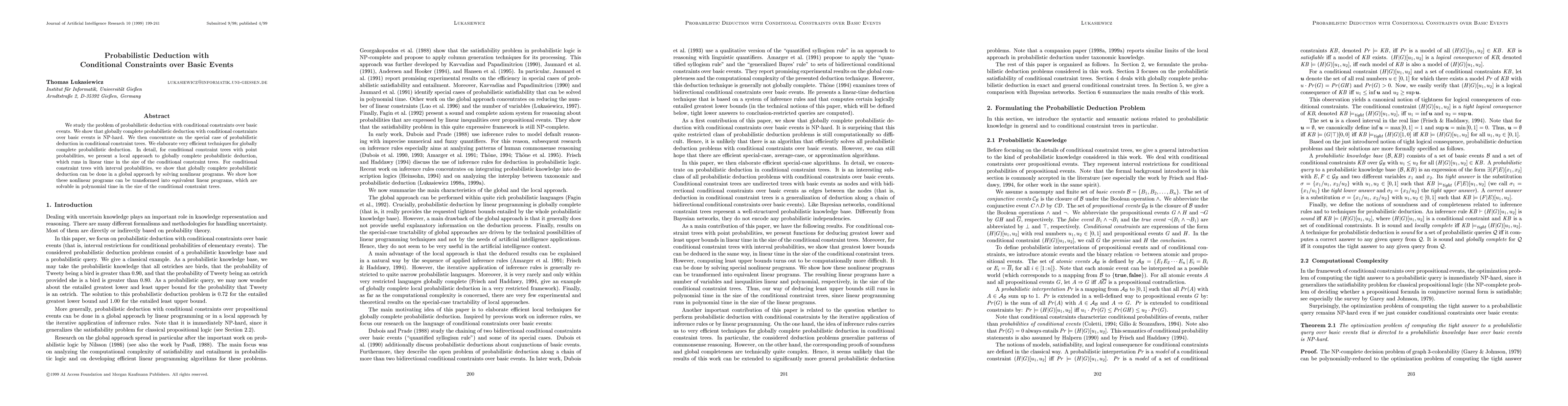 This paper investigates probabilistic deduction under conditional constraints over basic events, demonstrating its NP-hardness. It introduces efficient techniques for conditional constraint trees, achieving linear time complexity for point probabilities and polynomial time for interval probabilities by transforming nonlinear programs into equivalent linear programs.