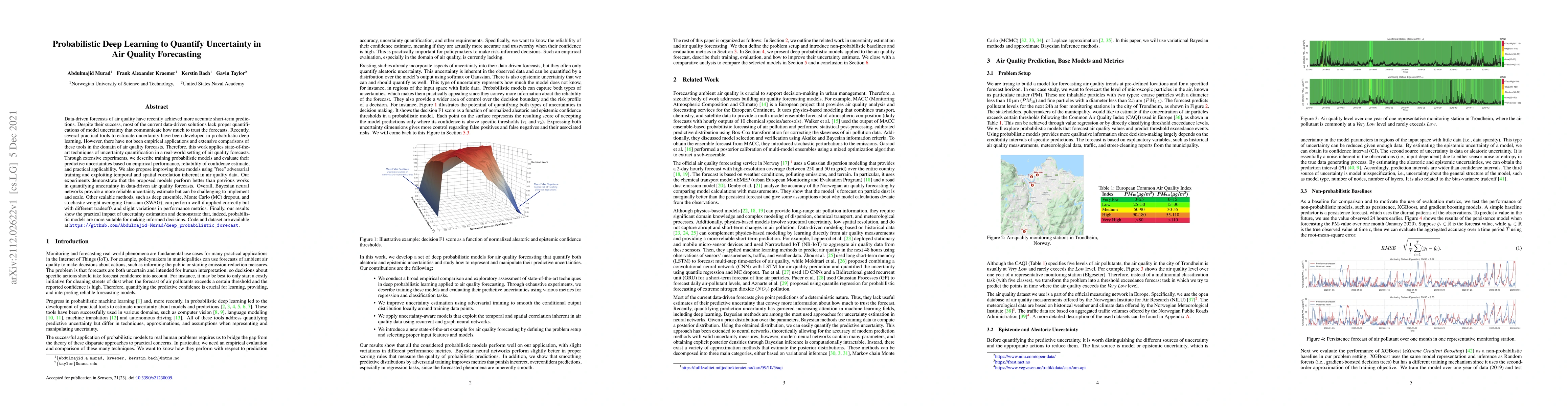 This paper explores the application of probabilistic deep learning techniques to quantify uncertainty in air quality forecasts, demonstrating improved performance over traditional methods. It finds that Bayesian neural networks offer the most reliable uncertainty estimates but are difficult to implement and scale, while scalable methods like deep ensembles and Monte Carlo dropout perform well with varying trade-offs. The study concludes that probabilistic models are better suited for informed decision-making.