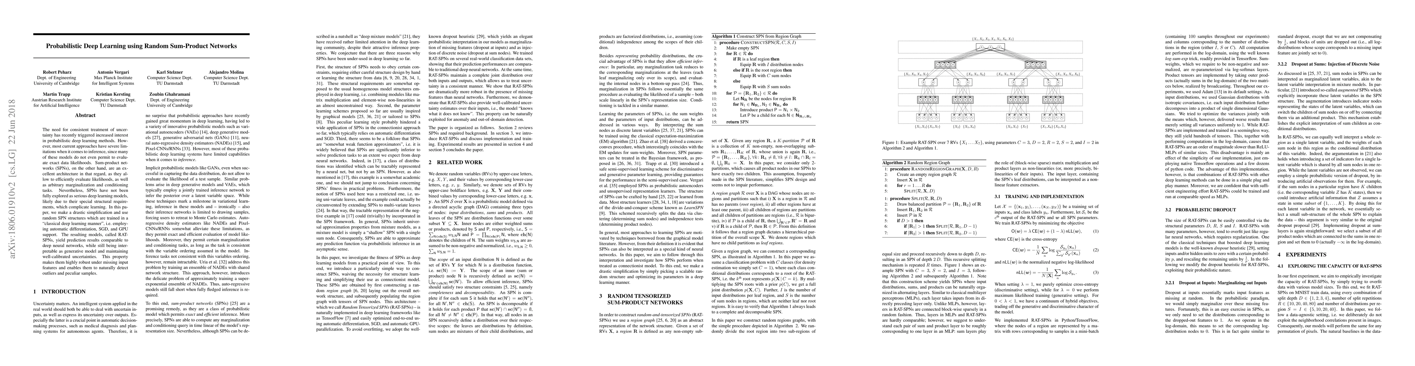This paper proposes Random Sum-Product Networks (RAT-SPNs) to address the limitations of current probabilistic deep learning methods by simplifying sum-product networks into a trainable form using standard deep learning techniques. RAT-SPNs maintain interpretability and well-calibrated uncertainties, offering robustness against missing data and natural outlier detection.