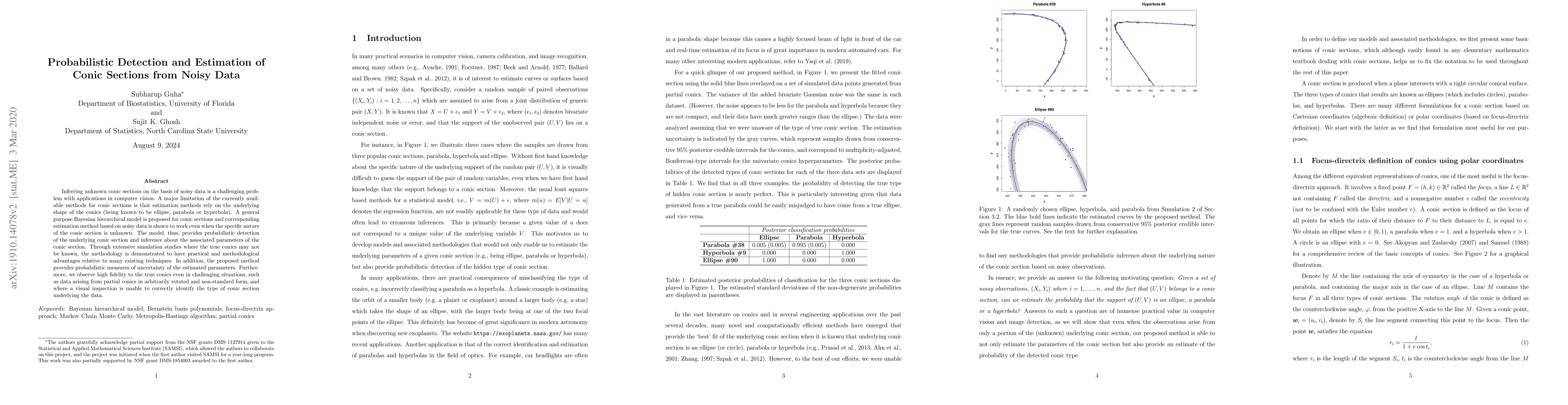 This paper proposes a Bayesian hierarchical model for probabilistic detection and estimation of conic sections from noisy data, offering a general approach that does not require prior knowledge of the conic type. The method demonstrates practical advantages and high fidelity in identifying conics even in complex, partially visible, and rotated forms.