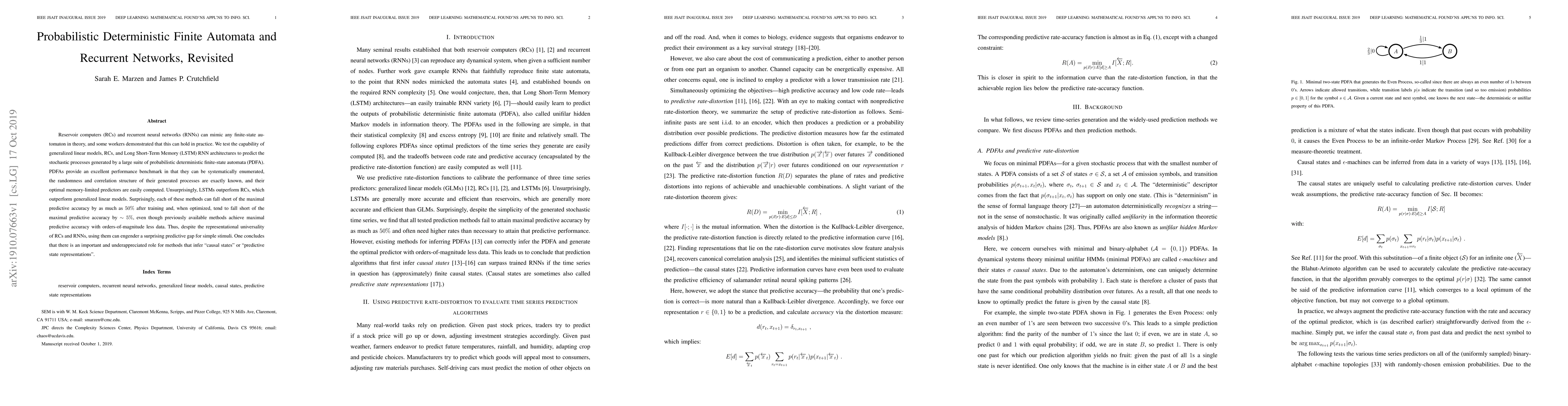 Reservoir computers (RCs) and recurrent neural networks (RNNs) can mimic any finite-state automaton in theory, and some workers demonstrated that this can hold in practice. We test the capability of generalized linear models, RCs, and Long Short-Term Memory (LSTM) RNN architectures to predict the stochastic processes generated by a large suite of probabilistic deterministic finite-state automata (PDFA). PDFAs provide an excellent performance benchmark in that they can be systematically enumerated, the randomness and correlation structure of their generated processes are exactly known, and their optimal memory-limited predictors are easily computed. Unsurprisingly, LSTMs outperform RCs, which outperform generalized linear models. Surprisingly, each of these methods can fall short of the maximal predictive accuracy by as much as 50% after training and, when optimized, tend to fall short of the maximal predictive accuracy by ~5%, even though previously available methods achieve maximal predictive accuracy with orders-of-magnitude less data. Thus, despite the representational universality of RCs and RNNs, using them can engender a surprising predictive gap for simple stimuli. One concludes that there is an important and underappreciated role for methods that infer "causal states" or "predictive state representations".