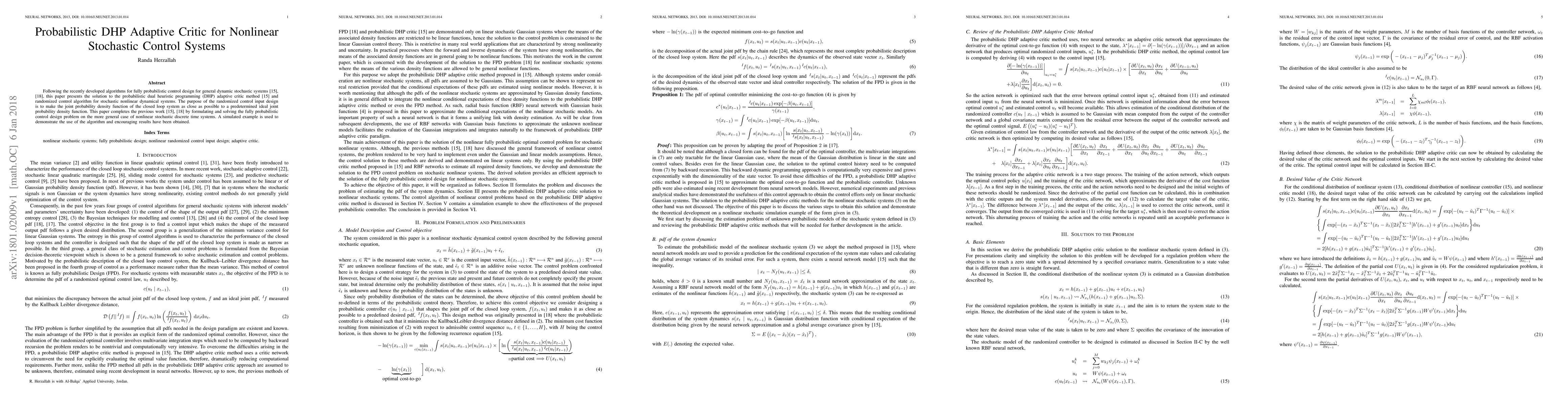 This paper develops a probabilistic dual heuristic programming adaptive critic method for stochastic nonlinear dynamical systems, aiming to align the closed loop system's joint probability density with a desired ideal function. The method is demonstrated through a simulated example, showing promising results.