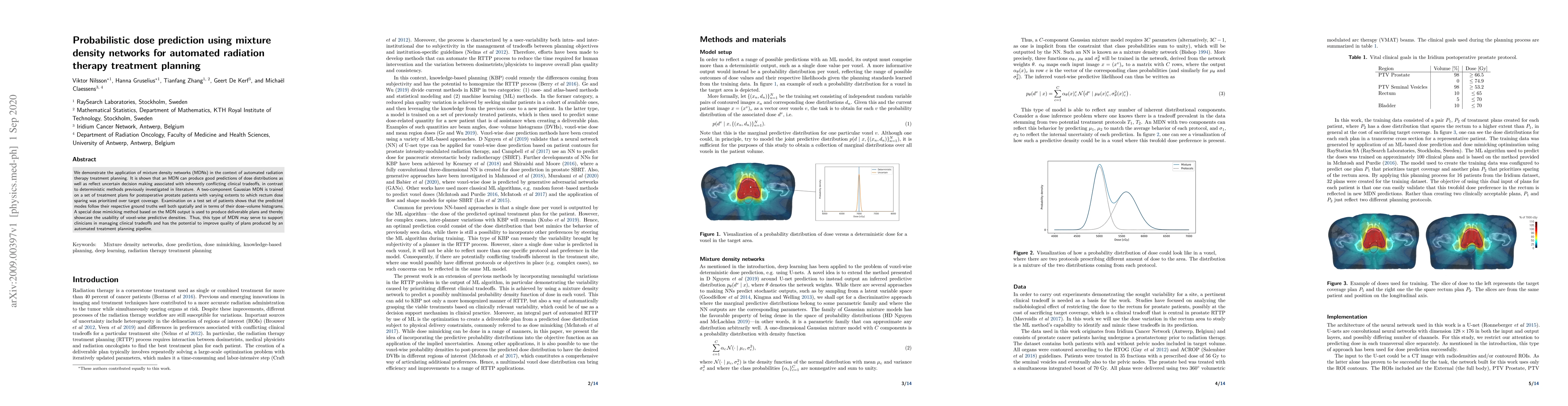 This paper applies mixture density networks (MDNs) to predict dose distributions in automated radiation therapy planning, demonstrating that MDNs can better reflect clinical tradeoffs compared to deterministic methods. The trained MDN effectively predicts dose distributions and mimics deliverable plans, potentially enhancing the quality of automated treatment plans.