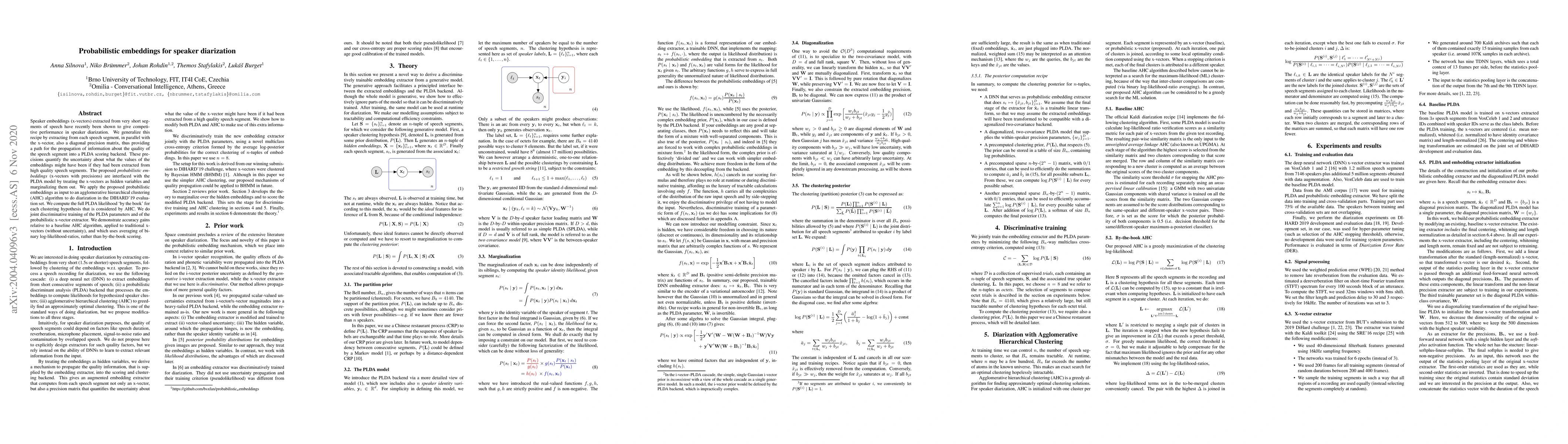 Speaker embeddings (x-vectors) extracted from very short segments of speech have recently been shown to give competitive performance in speaker diarization. We generalize this recipe by extracting from each speech segment, in parallel with the x-vector, also a diagonal precision matrix, thus providing a path for the propagation of information about the quality of the speech segment into a PLDA scoring backend. These precisions quantify the uncertainty about what the values of the embeddings might have been if they had been extracted from high quality speech segments. The proposed probabilistic embeddings (x-vectors with precisions) are interfaced with the PLDA model by treating the x-vectors as hidden variables and marginalizing them out. We apply the proposed probabilistic embeddings as input to an agglomerative hierarchical clustering (AHC) algorithm to do diarization in the DIHARD'19 evaluation set. We compute the full PLDA likelihood 'by the book' for each clustering hypothesis that is considered by AHC. We do joint discriminative training of the PLDA parameters and of the probabilistic x-vector extractor. We demonstrate accuracy gains relative to a baseline AHC algorithm, applied to traditional xvectors (without uncertainty), and which uses averaging of binary log-likelihood-ratios, rather than by-the-book scoring.