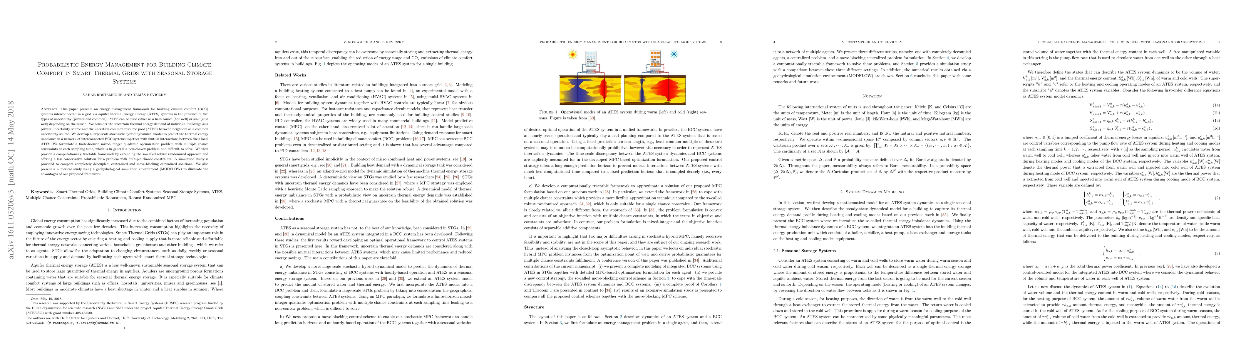 This paper develops a probabilistic energy management framework for smart thermal grids using aquifer thermal energy storage (ATES) to manage building climate comfort under uncertainty. It proposes a robust randomized optimization approach to handle multiple chance constraints and demonstrates its effectiveness through simulations and a geohydrological model.