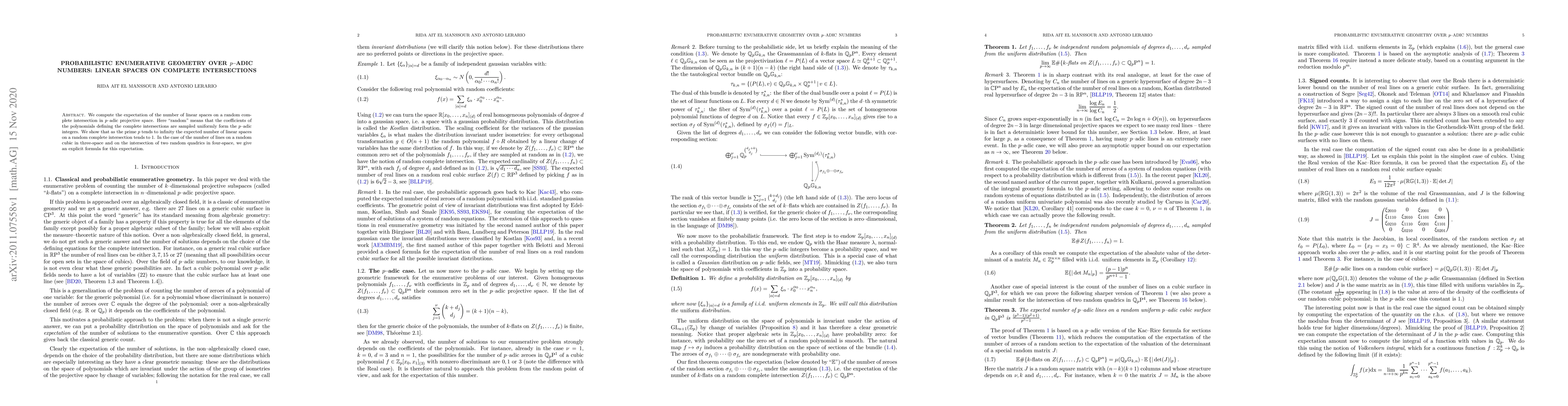The research paper calculates the expected number of linear spaces on random complete intersections in p-adic projective space, finding that as p tends to infinity, this expectation approaches 1.