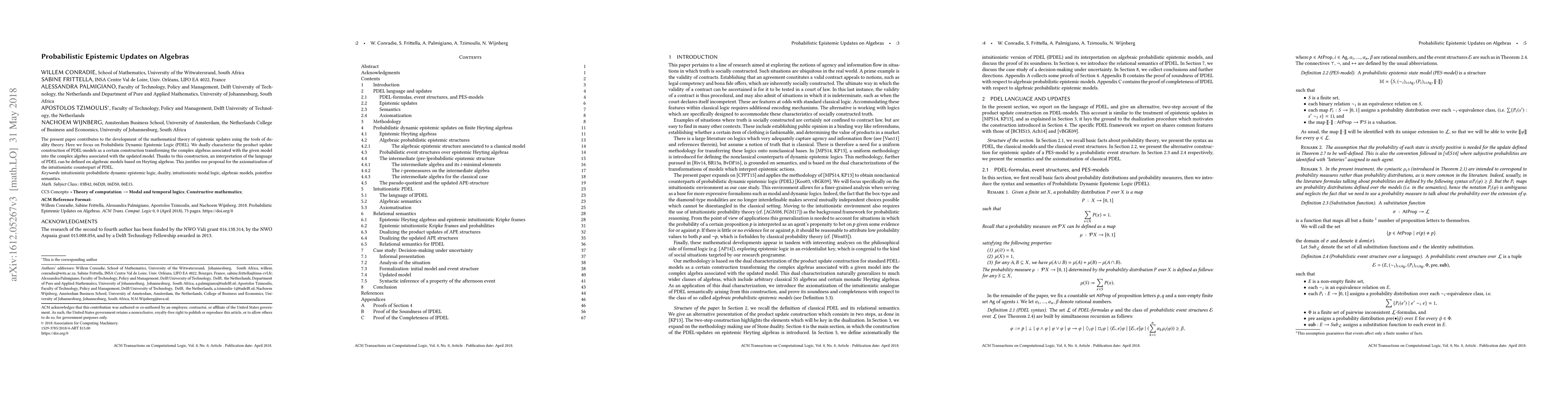 This paper develops the mathematical theory of epistemic updates using duality theory and Probabilistic Dynamic Epistemic Logic (PDEL), presenting a construction that transforms complex algebras for updated models, and proposing an axiomatization for its intuitionistic counterpart with proven soundness and completeness.