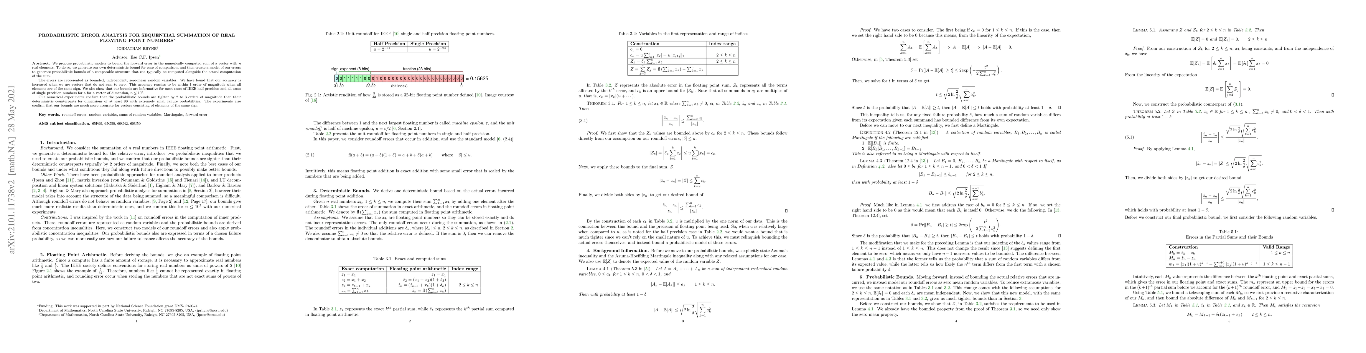 This paper derives probabilistic bounds for the relative forward error in floating point summation of real numbers, showing that they are significantly tighter than deterministic bounds. Numerical experiments in Julia demonstrate that the bounds can be 1-2 orders of magnitude tighter with a failure probability of $10^{-16}$, especially when all summands share the same sign.