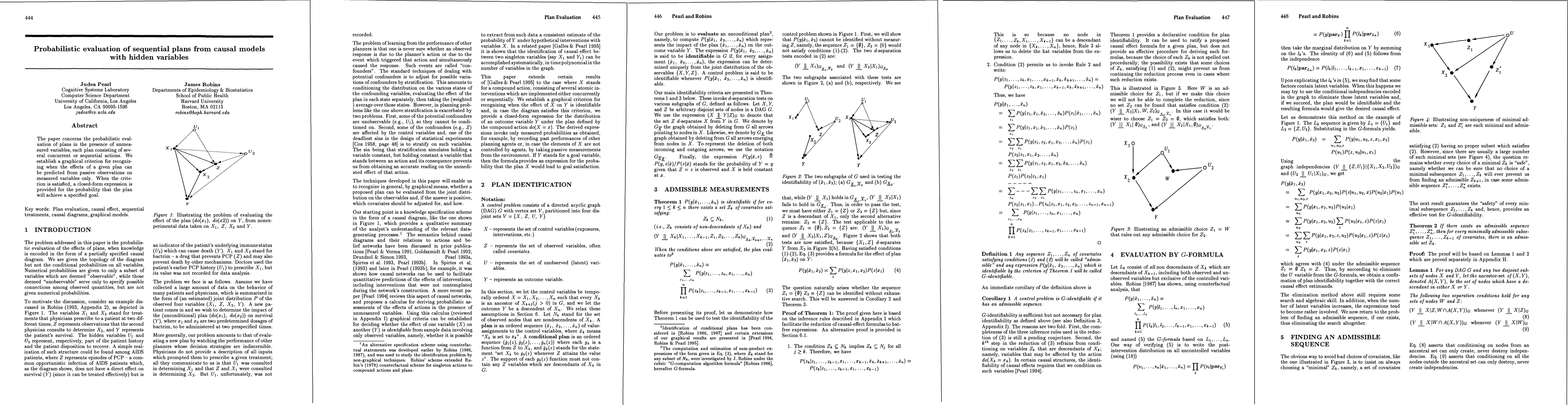 This paper develops a method for probabilistically evaluating sequential plans in causal models with hidden variables, providing a graphical criterion to determine when plan outcomes can be predicted from observed data. When applicable, it offers a closed-form expression for the probability of achieving specified goals.
