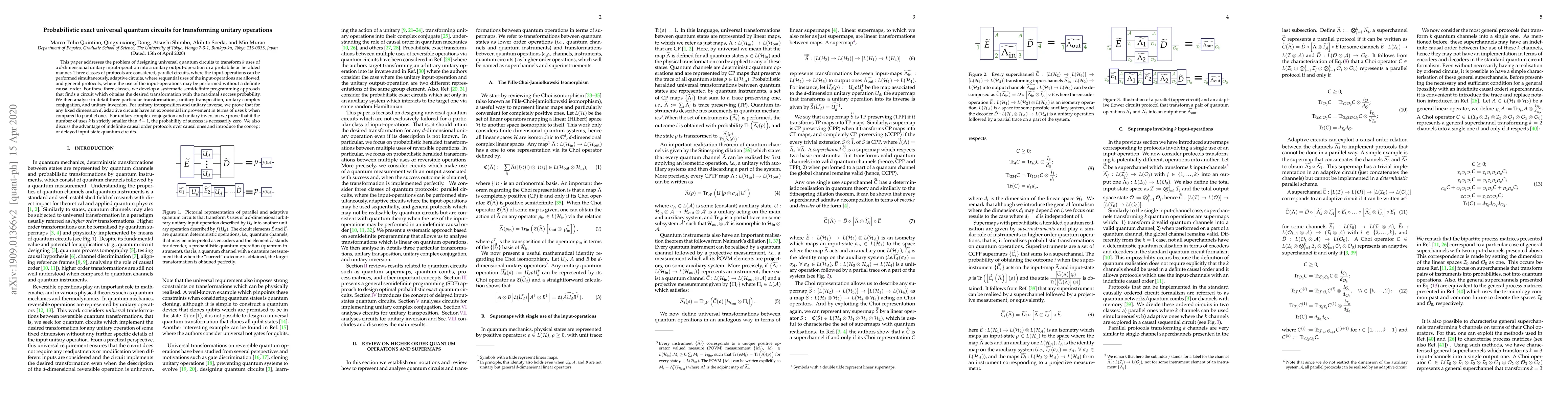 This paper develops a systematic semidefinite programming approach to design probabilistic universal quantum circuits for transforming $k$ uses of a $d$-dimensional unitary operation into a desired output. It compares adaptive, parallel, and general protocols, proving exponential improvements for adaptive circuits in certain transformations and zero success probability for others.
