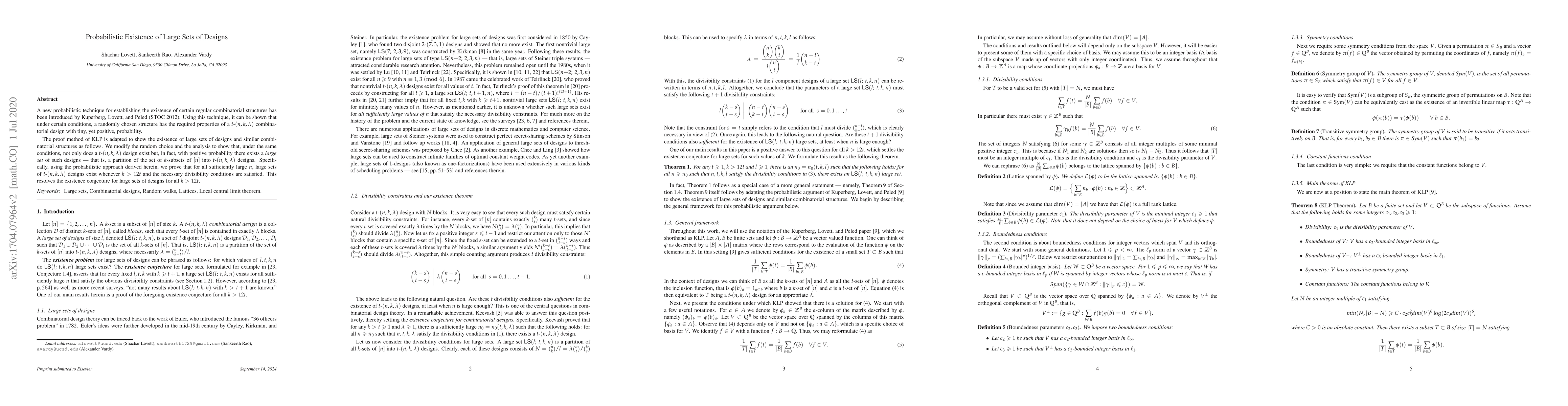 A new probabilistic technique for establishing the existence of certain regular combinatorial structures has been recentlyintroduced by Kuperberg, Lovett, and Peled (STOC 2012). Using this technique, it can be shown that under certain conditions, a randomly chosen structure has the required properties of a $t$-$(n,k,\lambda)$ combinatorial design with tiny, yet positive, probability. The proof method of KLP is adapted to show the existence of large sets of designs and similar combinatorial structures as follows. We modify the random choice and the analysis to show that, under the same conditions, not only does a $t$-$(n,k,\lambda)$ design exist but, in fact, with positive probability there exists a large set of such designs -- that is, a partition of the set of $k$-subsets of $[n]$ into $t$-designs $t$-$(n,k,\lambda)$ designs. Specifically, using the probabilistic approach derived herein, we prove that for all sufficiently large $n$, large sets of $t$-$(n,k,\lambda)$ designs exist whenever $k > 12t$ and the necessary divisibility conditions are satisfied. This resolves the existence conjecture for large sets of designs for all $k > 12t$.