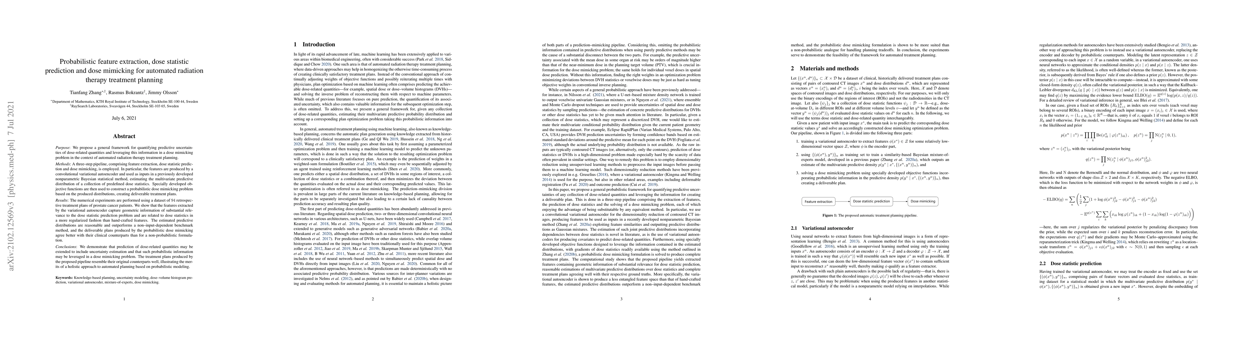 Purpose: We propose a general framework for quantifying predictive uncertainties of dose-related quantities and leveraging this information in a dose mimicking problem in the context of automated radiation therapy treatment planning. Methods: A three-step pipeline, comprising feature extraction, dose statistic prediction and dose mimicking, is employed. In particular, the features are produced by a convolutional variational autoencoder and used as inputs in a previously developed nonparametric Bayesian statistical method, estimating the multivariate predictive distribution of a collection of predefined dose statistics. Specially developed objective functions are then used to construct a probabilistic dose mimicking problem based on the produced distributions, creating deliverable treatment plans. Results: The numerical experiments are performed using a dataset of 94 retrospective treatment plans of prostate cancer patients. We show that the features extracted by the variational autoencoder capture geometric information of substantial relevance to the dose statistic prediction problem and are related to dose statistics in a more regularized fashion than hand-crafted features. The estimated predictive distributions are reasonable and outperforms a non-input-dependent benchmark method, and the deliverable plans produced by the probabilistic dose mimicking agree better with their clinical counterparts than for a non-probabilistic formulation. Conclusions: We demonstrate that prediction of dose-related quantities may be extended to include uncertainty estimation and that such probabilistic information may be leveraged in a dose mimicking problem. The treatment plans produced by the proposed pipeline resemble their original counterparts well, illustrating the merits of a holistic approach to automated planning based on probabilistic modeling.