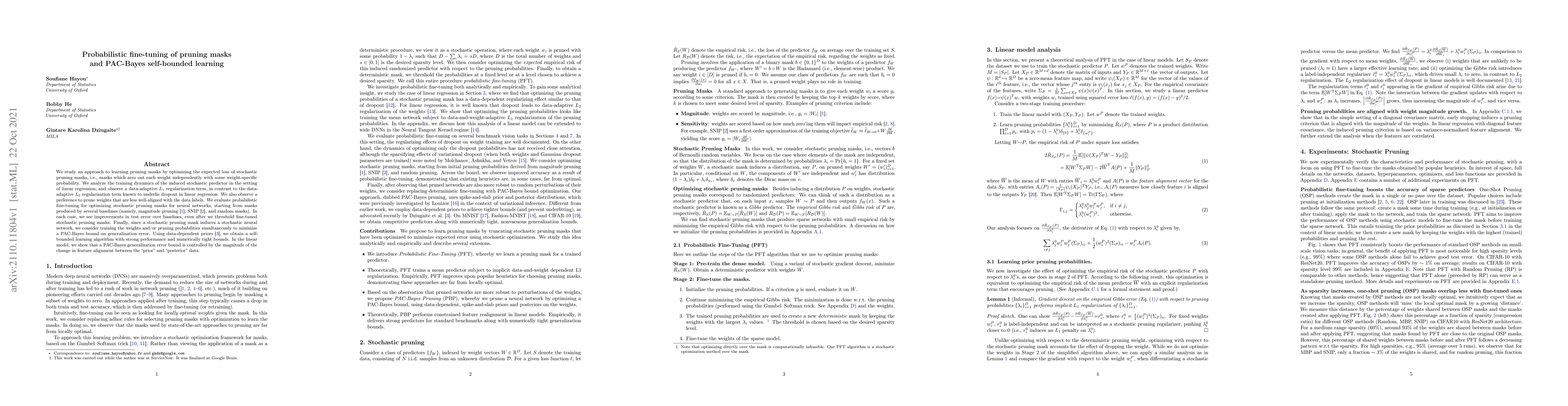 This paper proposes a method for learning pruning masks through probabilistic fine-tuning of stochastic masks, which adaptively prune weights based on their alignment with data labels. It also introduces a PAC-Bayes self-bounded learning algorithm that optimizes both weights and pruning probabilities to minimize generalization error.