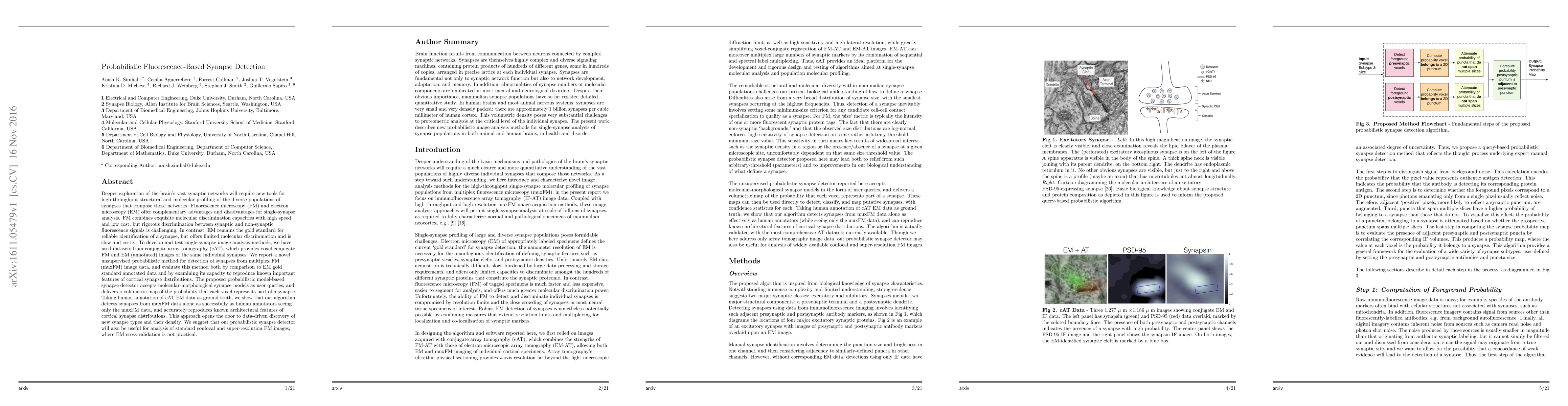 Brain function results from communication between neurons connected by complex synaptic networks. Synapses are themselves highly complex and diverse signaling machines, containing protein products of hundreds of different genes, some in hundreds of copies, arranged in precise lattice at each individual synapse. Synapses are fundamental not only to synaptic network function but also to network development, adaptation, and memory. In addition, abnormalities of synapse numbers or molecular components are implicated in most mental and neurological disorders. Despite their obvious importance, mammalian synapse populations have so far resisted detailed quantitative study. In human brains and most animal nervous systems, synapses are very small and very densely packed: there are approximately 1 billion synapses per cubic millimeter of human cortex. This volumetric density poses very substantial challenges to proteometric analysis at the critical level of the individual synapse. The present work describes new probabilistic image analysis methods for single-synapse analysis of synapse populations in both animal and human brains.