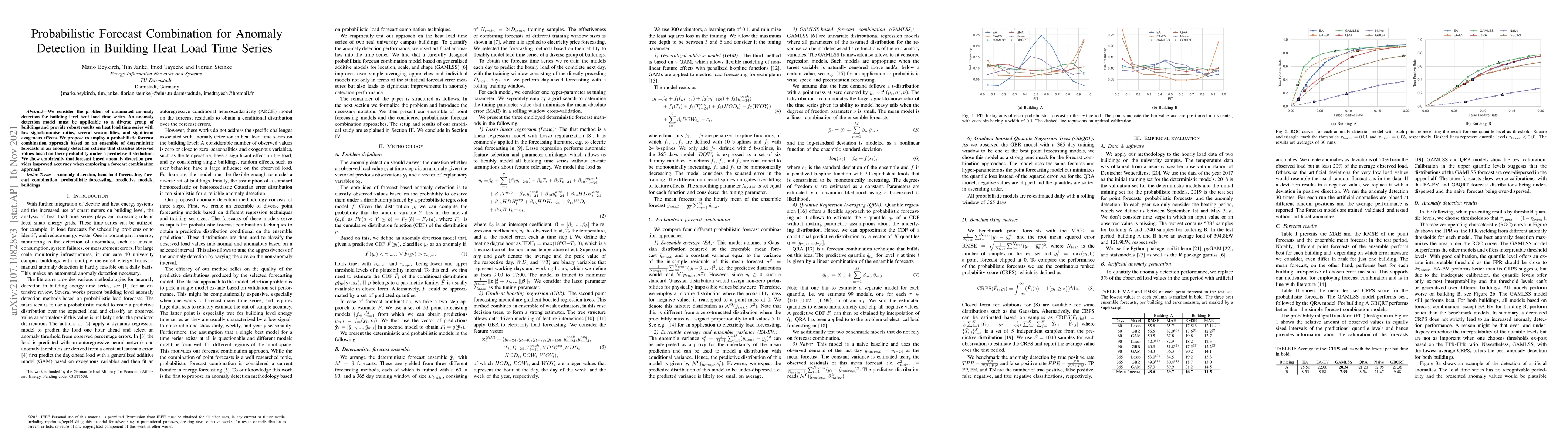 This paper proposes a probabilistic forecast combination approach for detecting anomalies in building heat load time series, achieving improved accuracy over traditional methods.