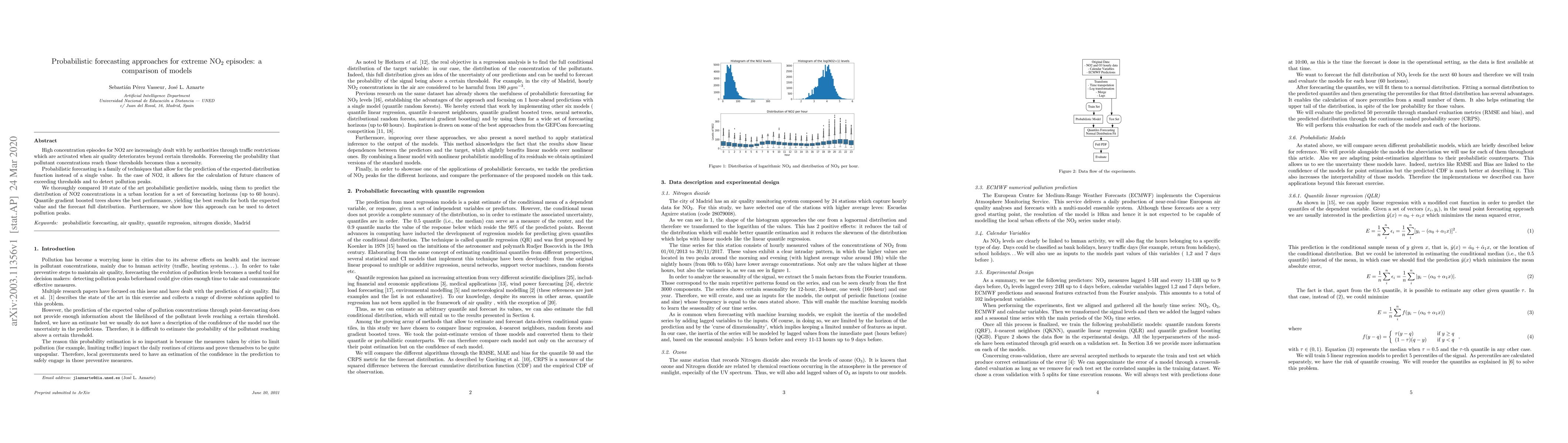 High concentration episodes for NO$_2$ are increasingly dealt with by authorities through traffic restrictions which are activated when air quality deteriorates beyond certain thresholds. Foreseeing the probability that pollutant concentrations reach those thresholds becomes thus a necessity. Probabilistic forecasting is a family of techniques that allow for the prediction of the expected distribution function instead of a single value. In the case of NO$_2$, it allows for the calculation of future chances of exceeding thresholds and to detect pollution peaks. We thoroughly compared 10 state of the art probabilistic predictive models, using them to predict the distribution of NO$_2$ concentrations in a urban location for a set of forecasting horizons (up to 60 hours). Quantile gradient boosted trees shows the best performance, yielding the best results for both the expected value and the forecast full distribution. Furthermore, we show how this approach can be used to detect pollution peaks.