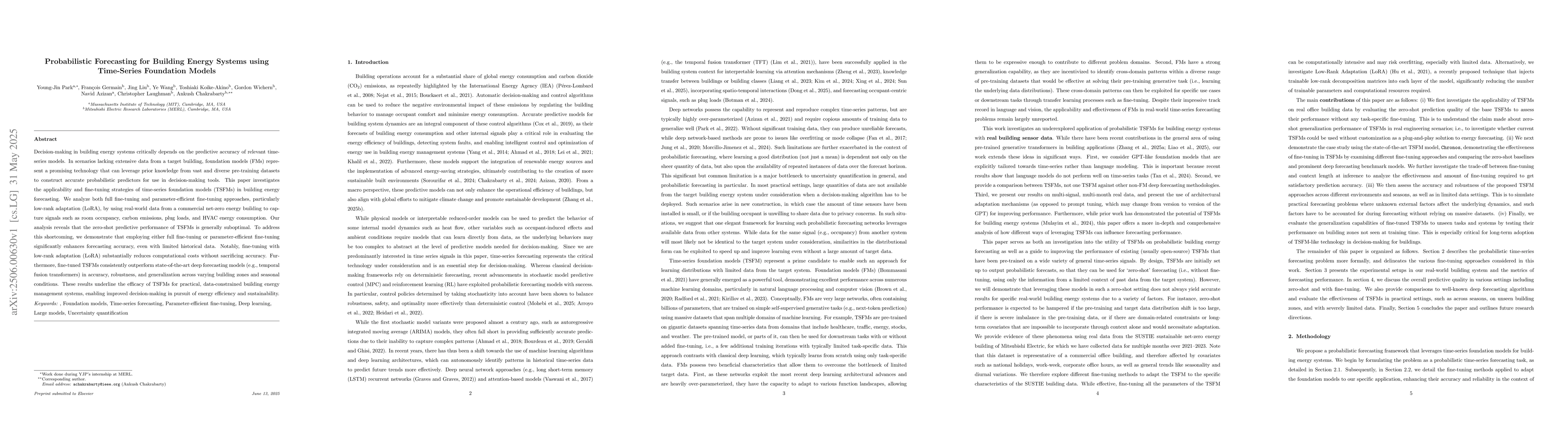 Decision-making in building energy systems critically depends on the predictive accuracy of relevant time-series models. In scenarios lacking extensive data from a target building, foundation models (FMs) represent a promising technology that can leverage prior knowledge from vast and diverse pre-training datasets to construct accurate probabilistic predictors for use in decision-making tools. This paper investigates the applicability and fine-tuning strategies of time-series foundation models (TSFMs) in building energy forecasting. We analyze both full fine-tuning and parameter-efficient fine-tuning approaches, particularly low-rank adaptation (LoRA), by using real-world data from a commercial net-zero energy building to capture signals such as room occupancy, carbon emissions, plug loads, and HVAC energy consumption. Our analysis reveals that the zero-shot predictive performance of TSFMs is generally suboptimal. To address this shortcoming, we demonstrate that employing either full fine-tuning or parameter-efficient fine-tuning significantly enhances forecasting accuracy, even with limited historical data. Notably, fine-tuning with low-rank adaptation (LoRA) substantially reduces computational costs without sacrificing accuracy. Furthermore, fine-tuned TSFMs consistently outperform state-of-the-art deep forecasting models (e.g., temporal fusion transformers) in accuracy, robustness, and generalization across varying building zones and seasonal conditions. These results underline the efficacy of TSFMs for practical, data-constrained building energy management systems, enabling improved decision-making in pursuit of energy efficiency and sustainability.