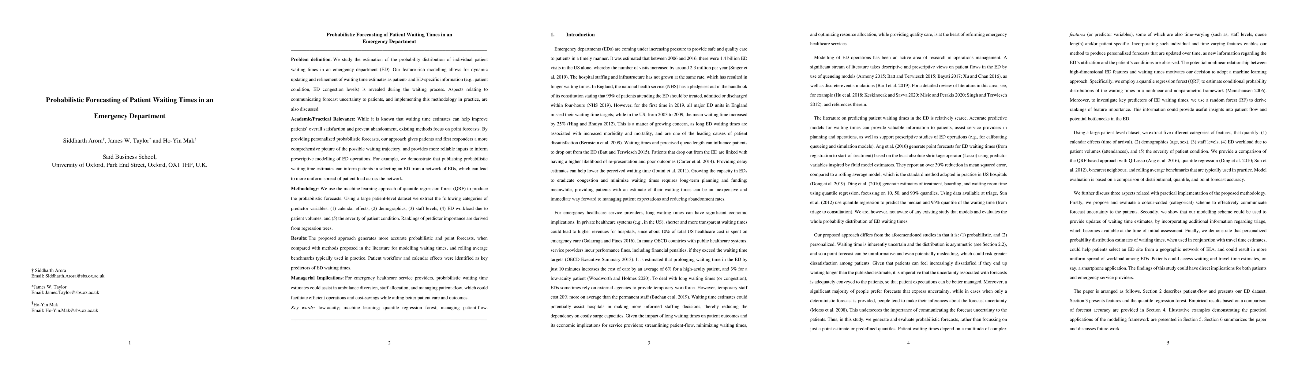 This paper develops a dynamic, feature-rich model to estimate the probability distribution of patient waiting times in emergency departments, updating predictions based on real-time patient and department conditions. It also explores how to communicate forecast uncertainty and practical implementation strategies.