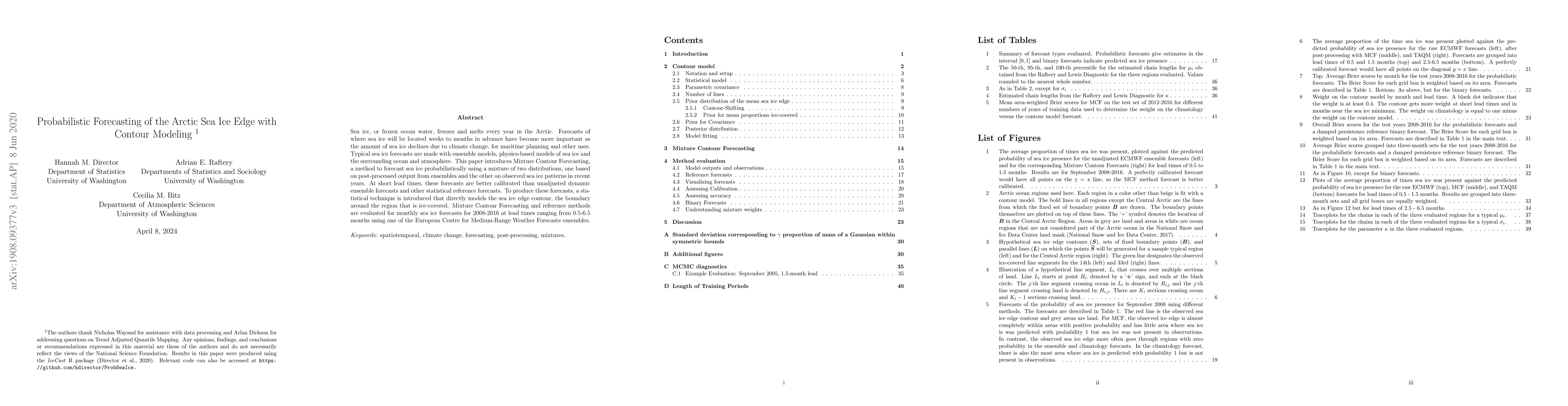 This paper introduces Mixture Contour Forecasting, a probabilistic method to predict Arctic sea ice edge contours using ensemble model data and recent observed patterns, achieving better short-term calibration than traditional ensemble forecasts. The method is evaluated against reference forecasts for monthly predictions from 2008-2016.