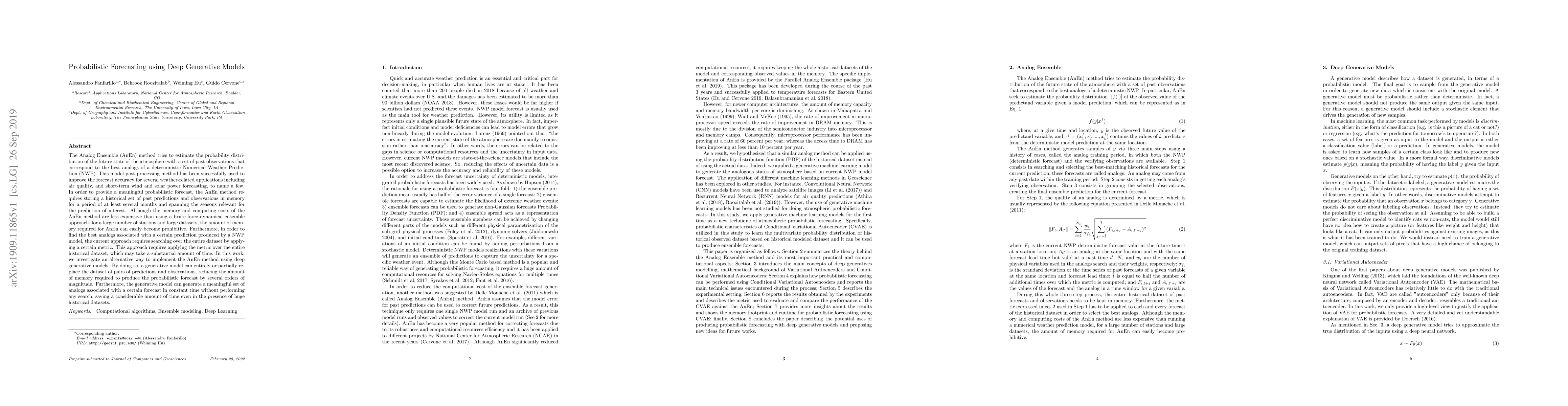 This research proposes using deep generative models to optimize the Analog Ensemble (AnEn) method for probabilistic weather forecasting. By replacing the historical dataset with a generative model, memory usage is drastically reduced, and time to generate analogs for a forecast is significantly cut down, making the process more efficient for large datasets.