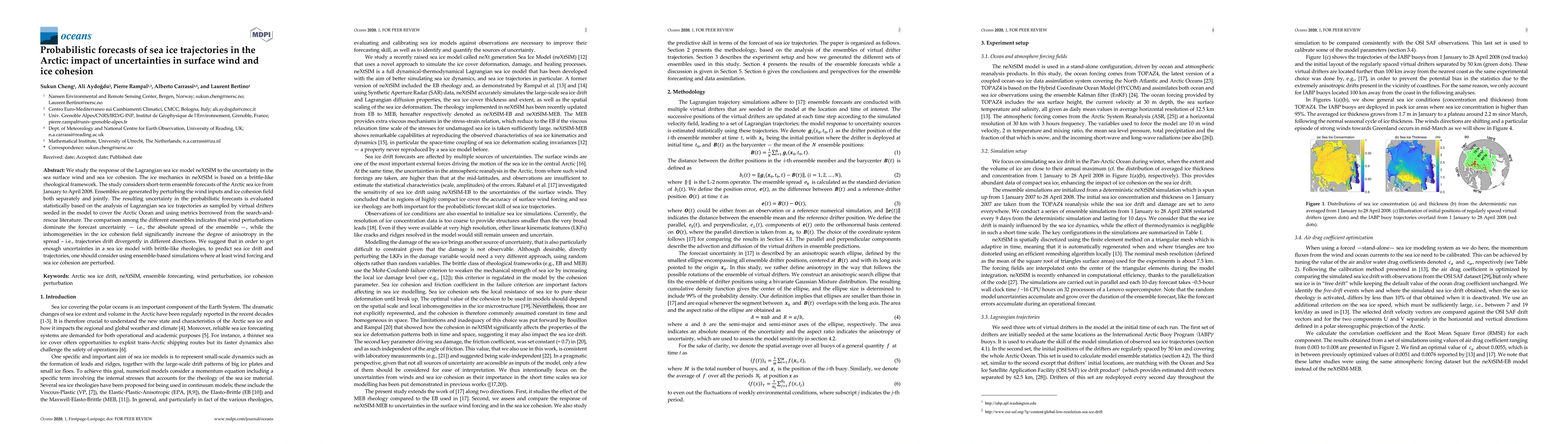 We study the response of the Lagrangian sea ice model neXtSIM to the uncertainty in the sea surface wind and sea ice cohesion. The ice mechanics in neXtSIM is based on a brittle-like rheological framework. The study considers short-term ensemble forecasts of the Arctic sea ice from January to April 2008. Ensembles are generated by perturbing the wind inputs and ice cohesion field both separately and jointly. The resulting uncertainty in the probabilistic forecasts is evaluated statistically based on the analysis of Lagrangian sea ice trajectories as sampled by virtual drifters seeded in the model to cover the Arctic Ocean and using metrics borrowed from the search-and-rescue literature. The comparison among the different ensembles indicates that wind perturbations dominate the forecast uncertainty i.e. the absolute spread of the ensemble, while the inhomogeneities in the ice cohesion field significantly increase the degree of anisotropy in the spread i.e. trajectories drift differently in different directions. We suggest that in order to get a full flavor of uncertainties in a sea ice model with brittle-like rheologies, to predict sea ice drift and trajectories, one should consider using ensemble-based simulations where both wind forcing and sea ice cohesion are perturbed.