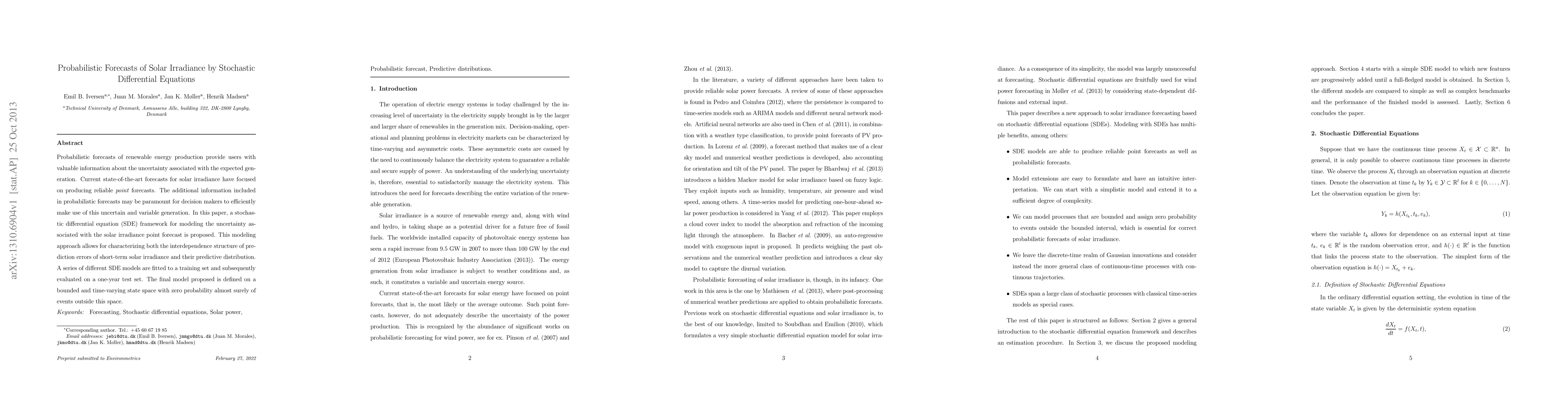 This paper proposes a stochastic differential equation (SDE) framework to model the uncertainty in solar irradiance forecasts, providing probabilistic forecasts that capture the interdependence of prediction errors. The developed SDE model is evaluated on a one-year test set, demonstrating its ability to characterize the predictive distribution within a bounded state space.