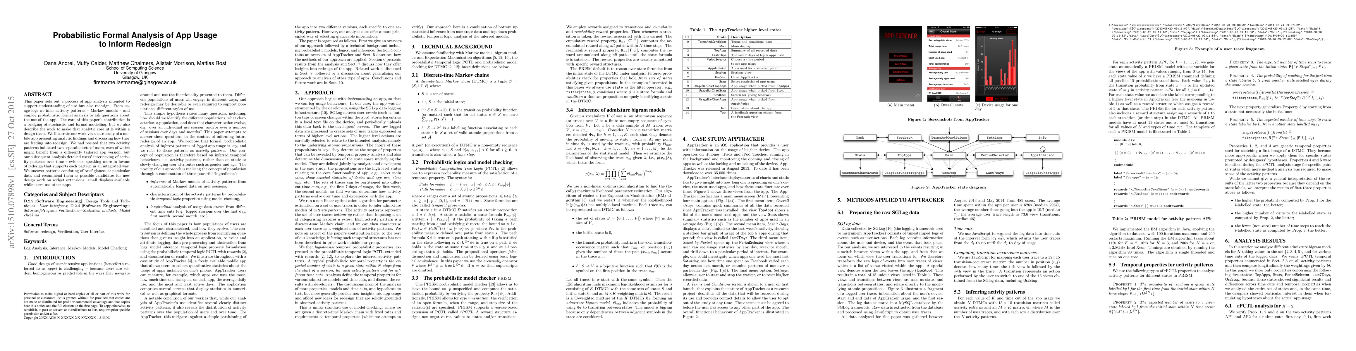This paper sets out a process of app analysis intended to support understanding of use but also redesign. From usage logs we infer activity patterns - Markov models - and employ probabilistic formal analysis to ask questions about the use of the app. The core of this paper's contribution is a bridging of stochastic and formal modelling, but we also describe the work to make that analytic core utile within a design team. We illustrate our work via a case study of a mobile app presenting analytic findings and discussing how they are feeding into redesign. We had posited that two activity patterns indicated two separable sets of users, each of which might benefit from a differently tailored app version, but our subsequent analysis detailed users' interleaving of activity patterns over time - evidence speaking more in favour of redesign that supports each pattern in an integrated way. We uncover patterns consisting of brief glances at particular data and recommend them as possible candidates for new design work on widget extensions: small displays available while users use other apps.