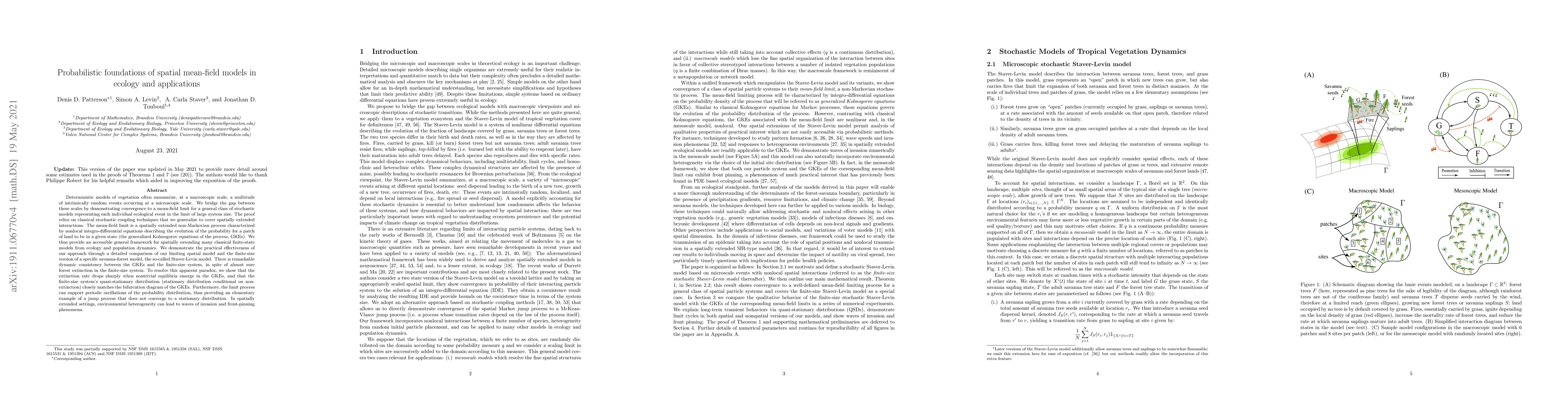 Deterministic models of vegetation often summarize, at a macroscopic scale, a multitude of intrinsically random events occurring at a microscopic scale. We bridge the gap between these scales by demonstrating convergence to a mean-field limit for a general class of stochastic models representing each individual ecological event in the limit of large system size. The proof relies on classical stochastic coupling techniques that we generalize to cover spatially extended interactions. The mean-field limit is a spatially extended non-Markovian process characterized by nonlocal integro-differential equations describing the evolution of the probability for a patch of land to be in a given state (the generalized Kolmogorov equations of the process, GKEs). We thus provide an accessible general framework for spatially extending many classical finite-state models from ecology and population dynamics. We demonstrate the practical effectiveness of our approach through a detailed comparison of our limiting spatial model and the finite-size version of a specific savanna-forest model, the so-called Staver-Levin model. There is remarkable dynamic consistency between the GKEs and the finite-size system, in spite of almost sure forest extinction in the finite-size system. To resolve this apparent paradox, we show that the extinction rate drops sharply when nontrivial equilibria emerge in the GKEs, and that the finite-size system's quasi-stationary distribution (stationary distribution conditional on non-extinction) closely matches the bifurcation diagram of the GKEs. Furthermore, the limit process can support periodic oscillations of the probability distribution, thus providing an elementary example of a jump process that does not converge to a stationary distribution. In spatially extended settings, environmental heterogeneity can lead to waves of invasion and front-pinning phenomena.