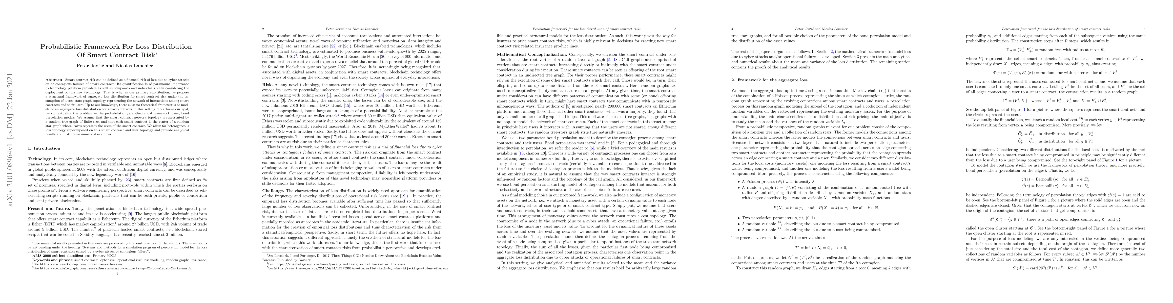 This paper proposes a probabilistic framework for quantifying the aggregate loss distribution of smart contract risks, using a tree-star graph topology model to represent interactions. It introduces analytical results and numerical examples for understanding potential losses due to cyber attacks or failures.