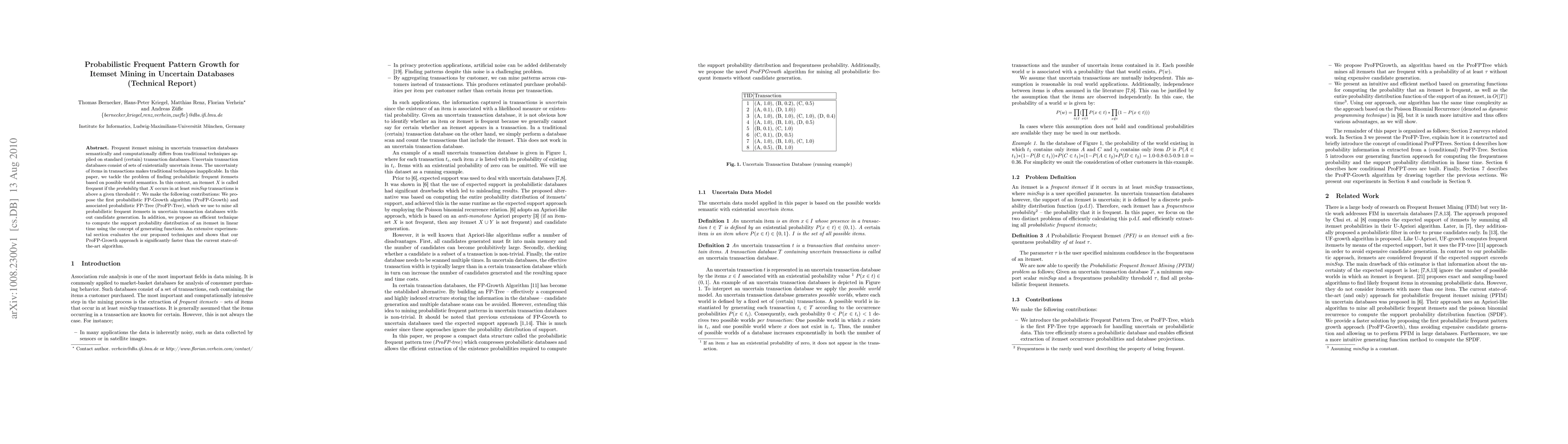 This paper introduces a novel probabilistic FP-Growth algorithm (ProFP-Growth) and its associated probabilistic FP-Tree (ProFP-Tree) for mining frequent itemsets in uncertain transaction databases. The proposed method efficiently computes support probability distributions in linear time, significantly outperforming existing state-of-the-art algorithms.