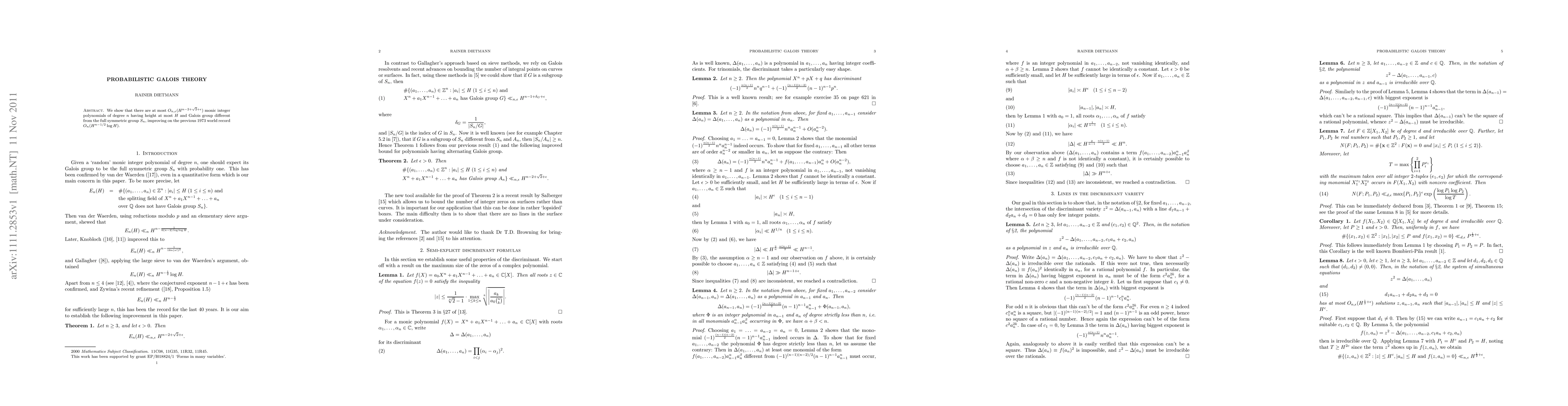 This research paper establishes an improved upper bound for the number of monic polynomials of degree n with height at most H and a Galois group distinct from S_n, improving on a 1973 world record.