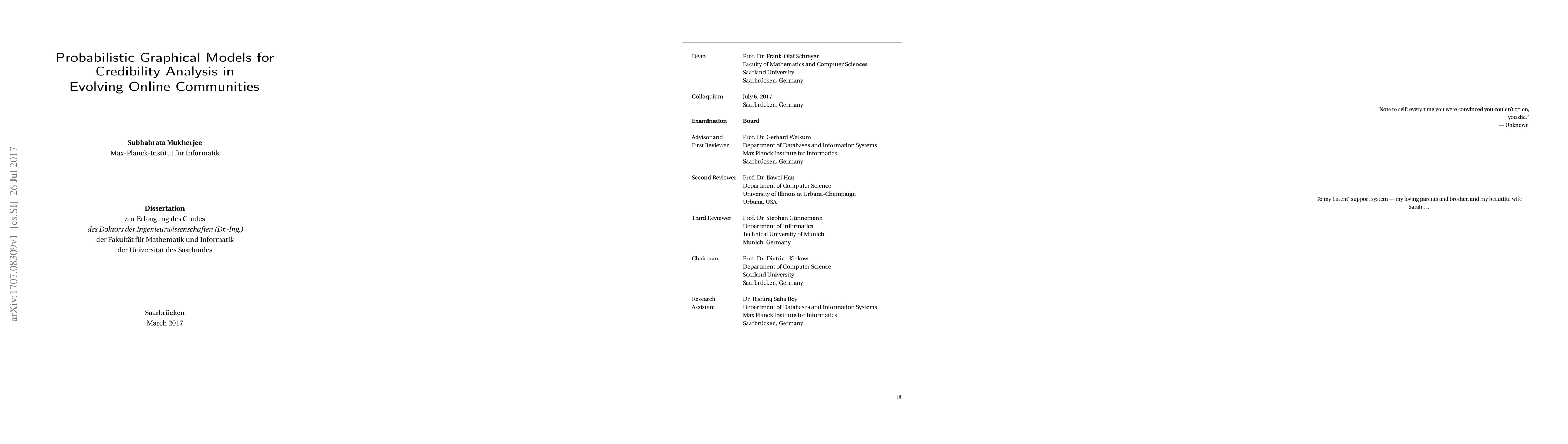 One of the major hurdles preventing the full exploitation of information from online communities is the widespread concern regarding the quality and credibility of user-contributed content. Prior works in this domain operate on a static snapshot of the community, making strong assumptions about the structure of the data (e.g., relational tables), or consider only shallow features for text classification. To address the above limitations, we propose probabilistic graphical models that can leverage the joint interplay between multiple factors in online communities --- like user interactions, community dynamics, and textual content --- to automatically assess the credibility of user-contributed online content, and the expertise of users and their evolution with user-interpretable explanation. To this end, we devise new models based on Conditional Random Fields for different settings like incorporating partial expert knowledge for semi-supervised learning, and handling discrete labels as well as numeric ratings for fine-grained analysis. This enables applications such as extracting reliable side-effects of drugs from user-contributed posts in healthforums, and identifying credible content in news communities. Online communities are dynamic, as users join and leave, adapt to evolving trends, and mature over time. To capture this dynamics, we propose generative models based on Hidden Markov Model, Latent Dirichlet Allocation, and Brownian Motion to trace the continuous evolution of user expertise and their language model over time. This allows us to identify expert users and credible content jointly over time, improving state-of-the-art recommender systems by explicitly considering the maturity of users. This also enables applications such as identifying helpful product reviews, and detecting fake and anomalous reviews with limited information.