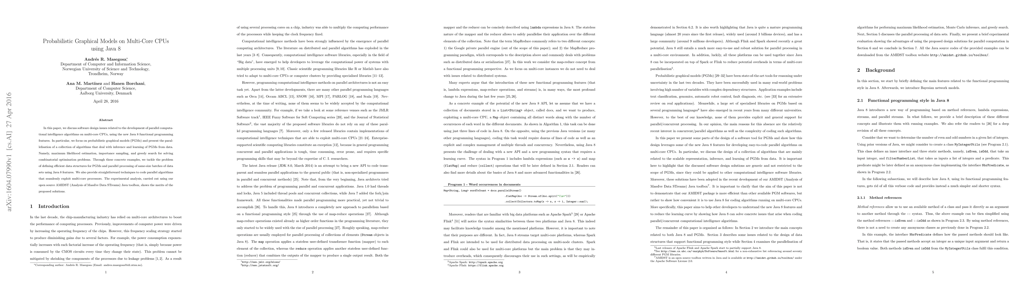 This paper explores the parallelization of probabilistic graphical models (PGMs) on multi-core CPUs using Java 8's functional programming features, focusing on algorithms like maximum likelihood estimation and importance sampling. The study provides efficient data structures and techniques for parallel processing, demonstrating benefits through the AMIDST toolbox.