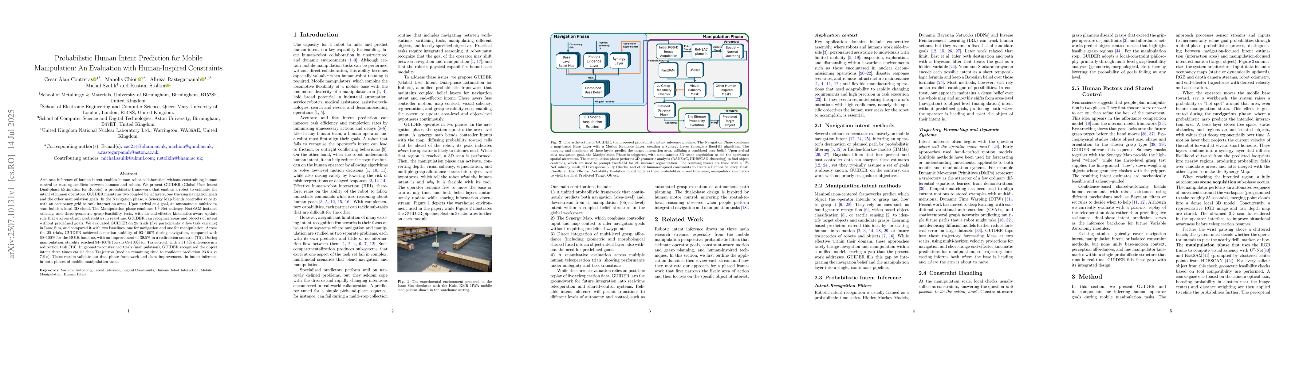 Accurate inference of human intent enables human-robot collaboration without constraining human control or causing conflicts between humans and robots. We present GUIDER (Global User Intent Dual-phase Estimation for Robots), a probabilistic framework that enables a robot to estimate the intent of human operators. GUIDER maintains two coupled belief layers, one tracking navigation goals and the other manipulation goals. In the Navigation phase, a Synergy Map blends controller velocity with an occupancy grid to rank interaction areas. Upon arrival at a goal, an autonomous multi-view scan builds a local 3D cloud. The Manipulation phase combines U2Net saliency, FastSAM instance saliency, and three geometric grasp-feasibility tests, with an end-effector kinematics-aware update rule that evolves object probabilities in real-time. GUIDER can recognize areas and objects of intent without predefined goals. We evaluated GUIDER on 25 trials (five participants x five task variants) in Isaac Sim, and compared it with two baselines, one for navigation and one for manipulation. Across the 25 trials, GUIDER achieved a median stability of 93-100% during navigation, compared with 60-100% for the BOIR baseline, with an improvement of 39.5% in a redirection scenario (T5). During manipulation, stability reached 94-100% (versus 69-100% for Trajectron), with a 31.4% difference in a redirection task (T3). In geometry-constrained trials (manipulation), GUIDER recognized the object intent three times earlier than Trajectron (median remaining time to confident prediction 23.6 s vs 7.8 s). These results validate our dual-phase framework and show improvements in intent inference in both phases of mobile manipulation tasks.