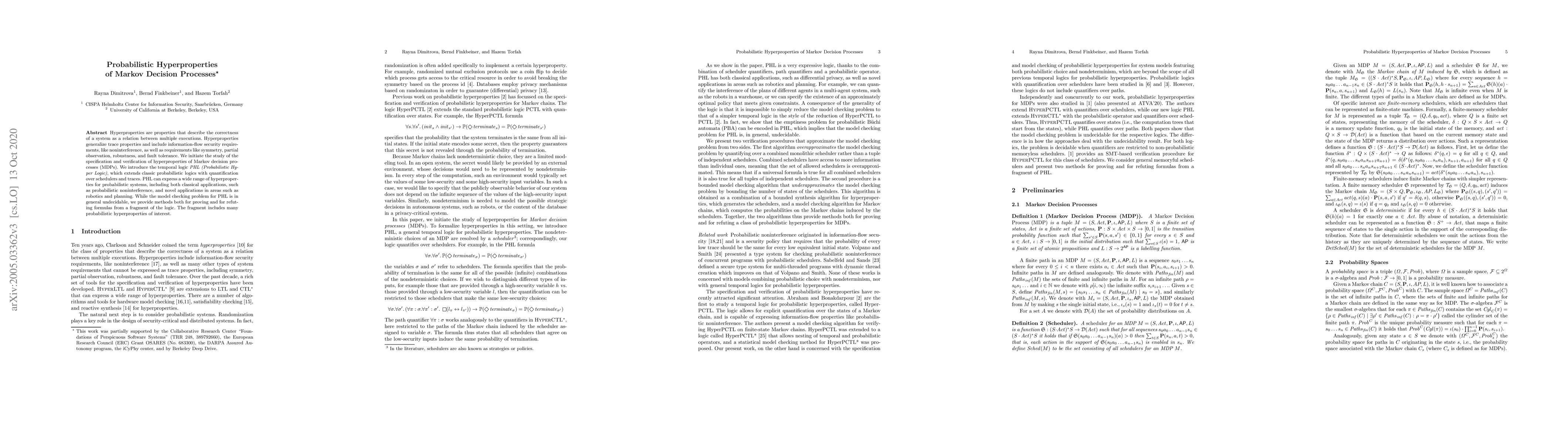 The paper introduces PHL, a temporal logic for specifying probabilistic hyperproperties of Markov decision processes (MDPs), combining quantification over both schedulers and paths with a probabilistic operator. It explores the specification and verification of hyperproperties, which describe system correctness as relations between multiple executions, encompassing information-flow security requirements and other properties like symmetry, partial observation, robustness, and fault tolerance.