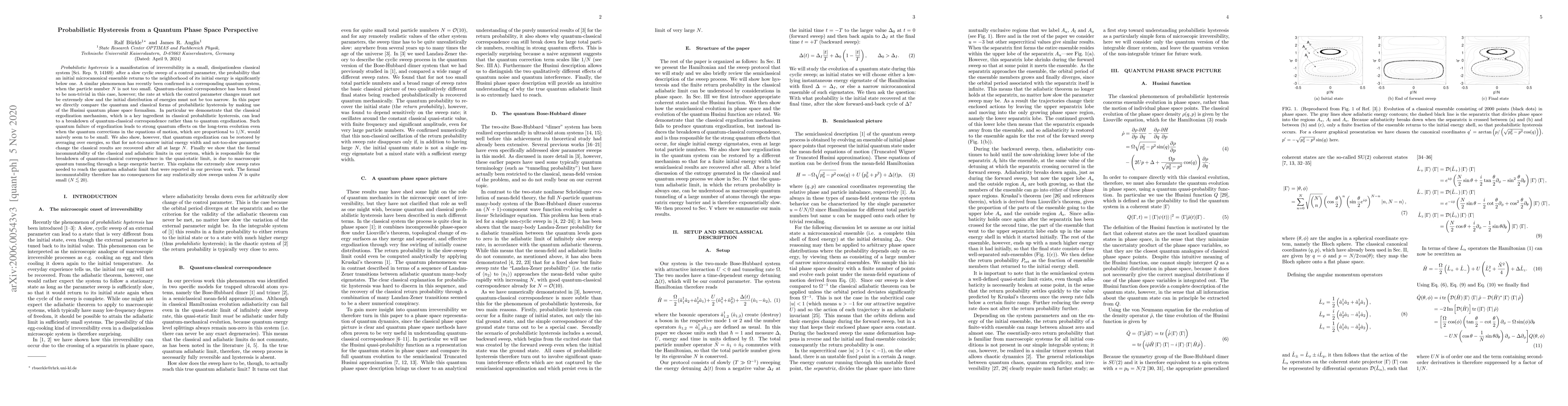 \emph{Probabilistic hysteresis} is a manifestation of irreversibility in a small, isolated classical system [Sci. Rep. 9, 14169]: after a slow cyclic sweep of a control parameter, the probability that a microcanonical ensemble returns to the neighborhood of its initial energy is significantly below one. A similar phenomenon has recently been confirmed in a corresponding quantum system for not too small particle number $N$. Quantum-classical correspondence has been found to be non-trivial in this case, however; the rate at which the control parameter changes must not be extremely slow and the initial distribution of energies must not be too narrow. In this paper we directly compare the quantum and classical forms of probabilistic hysteresis by making use of the Husimi quantum phase space formalism. In particular we demonstrate that the classical ergodization mechanism, which is a key ingredient in classical probabilistic hysteresis, can lead to a breakdown of quantum-classical correspondence rather than to quantum ergodization. As a result strong quantum effects in the long-term evolution are present, even though the quantum corrections in the equations of motion are proportional to $1/N$ and therefore would naively seem to be small. We also show, however, that quantum ergodization is restored by averaging over energies, so that for sufficient initial energy width and not-too-slow sweep rate the classical results are recovered after all. Finally we show that the formal incommutability of the classical and adiabatic limits in our system, leading to the breakdown of quantum-classical correspondence in the quasi-static limit, is due to macroscopic quantum tunneling through a large energetic barrier. This explains the extremely slow sweep rates needed to reach the quantum adiabatic limit that were reported in our previous work.