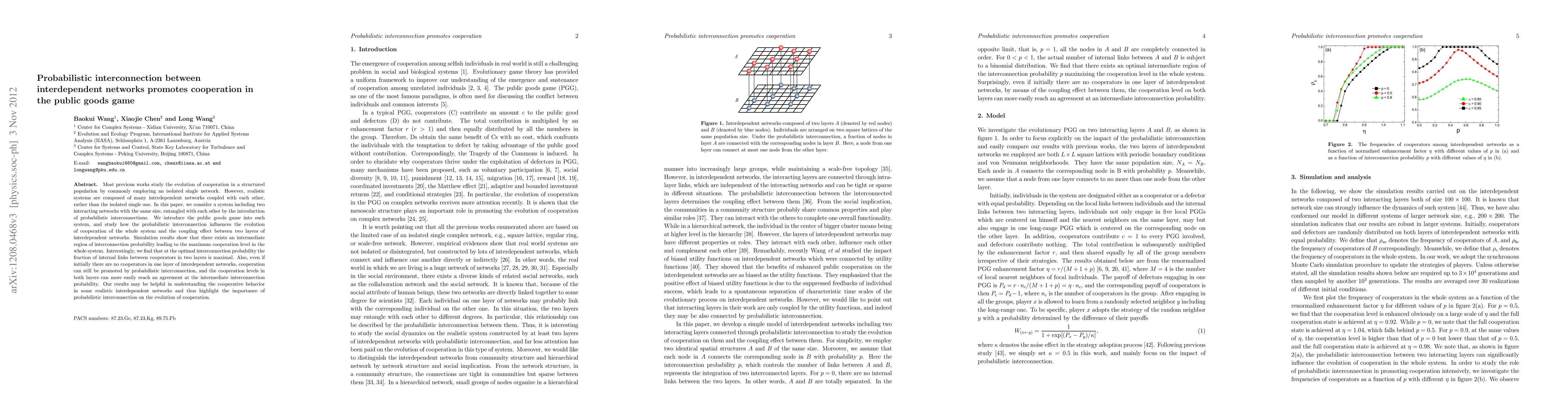 This paper investigates how probabilistic interconnections between two interdependent networks influence cooperation in a public goods game. Results show that an intermediate probability of interconnection maximizes cooperation, highlighting the significance of such connections in promoting cooperative behavior in realistic interdependent systems.