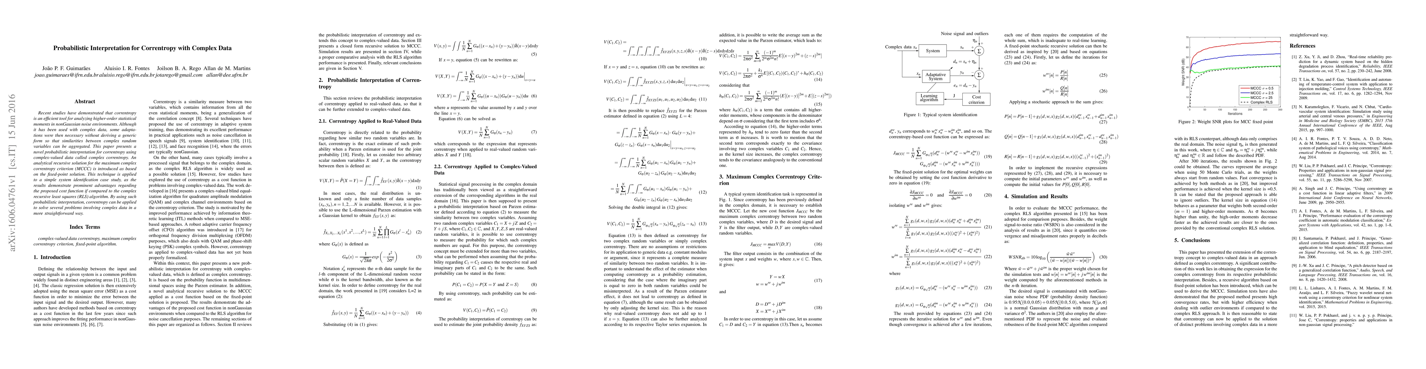 Recent studies have demonstrated that correntropy is an efficient tool for analyzing higher-order statistical moments in nonGaussian noise environments. Although it has been used with complex data, some adaptations were then necessary without deriving a generic form so that similarities between complex random variables can be aggregated. This paper presents a novel probabilistic interpretation for correntropy using complex-valued data called complex correntropy. An analytical recursive solution for the maximum complex correntropy criterion (MCCC) is introduced as based on the fixedpoint solution. This technique is applied to a simple system identification case study, as the results demonstrate prominent advantages regarding the proposed cost function if compared to the complex recursive least squares (RLS) algorithm. By using such probabilistic interpretation, correntropy can be applied to solve several problems involving complex data in a more straightforward way.