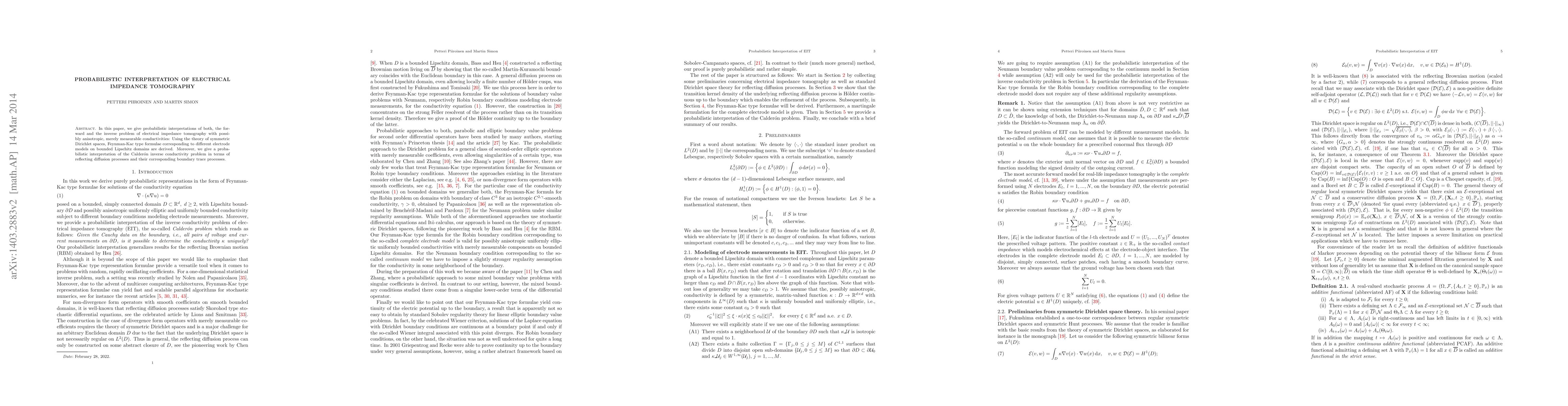 This paper provides probabilistic interpretations for both the forward and inverse problems in electrical impedance tomography, utilizing symmetric Dirichlet spaces and Feynman-Kac formulae. It also interprets the Calderón inverse conductivity problem through reflecting diffusion processes and boundary trace processes.